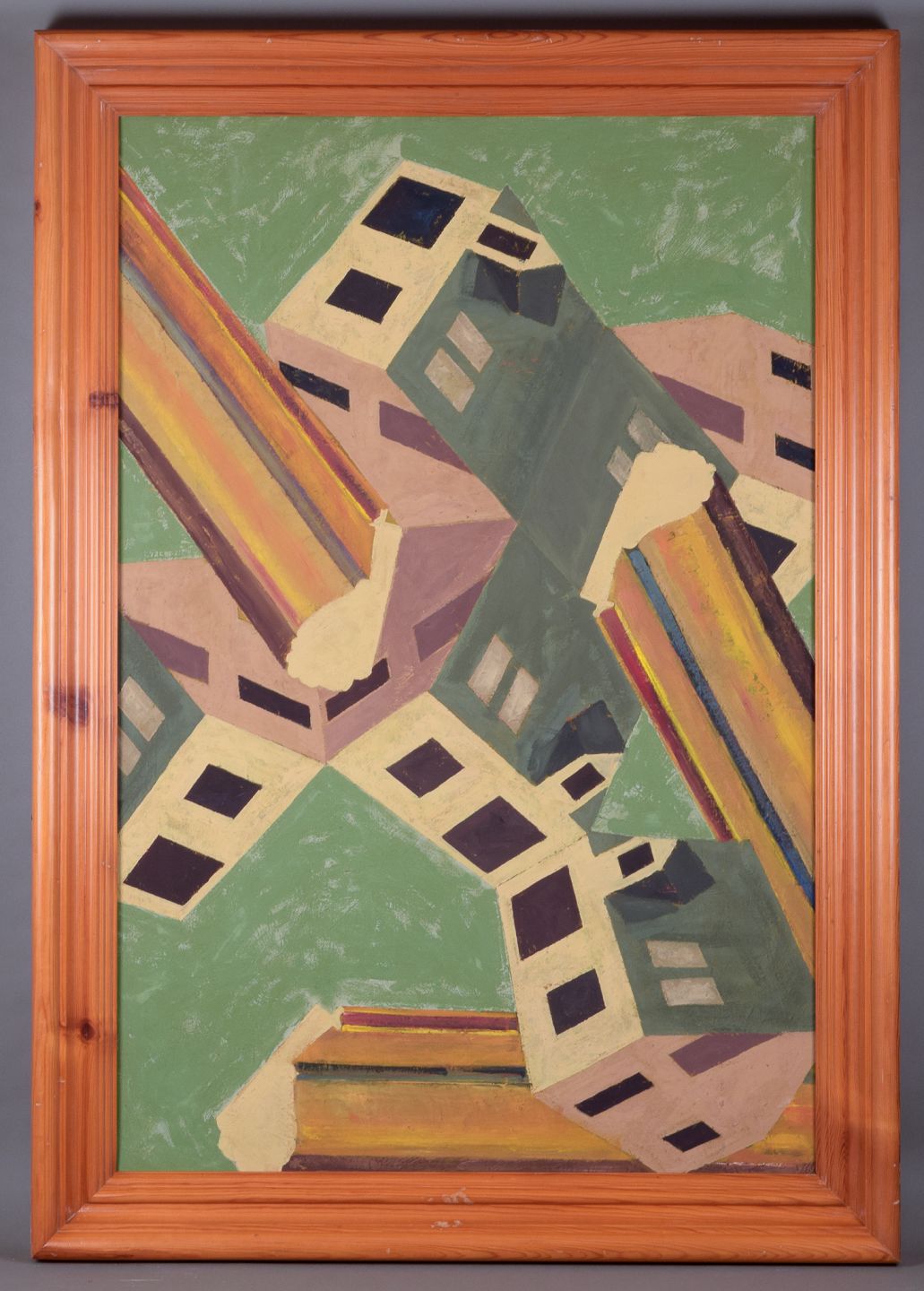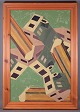 Large painting of architectural structures in a futuristic style.