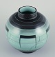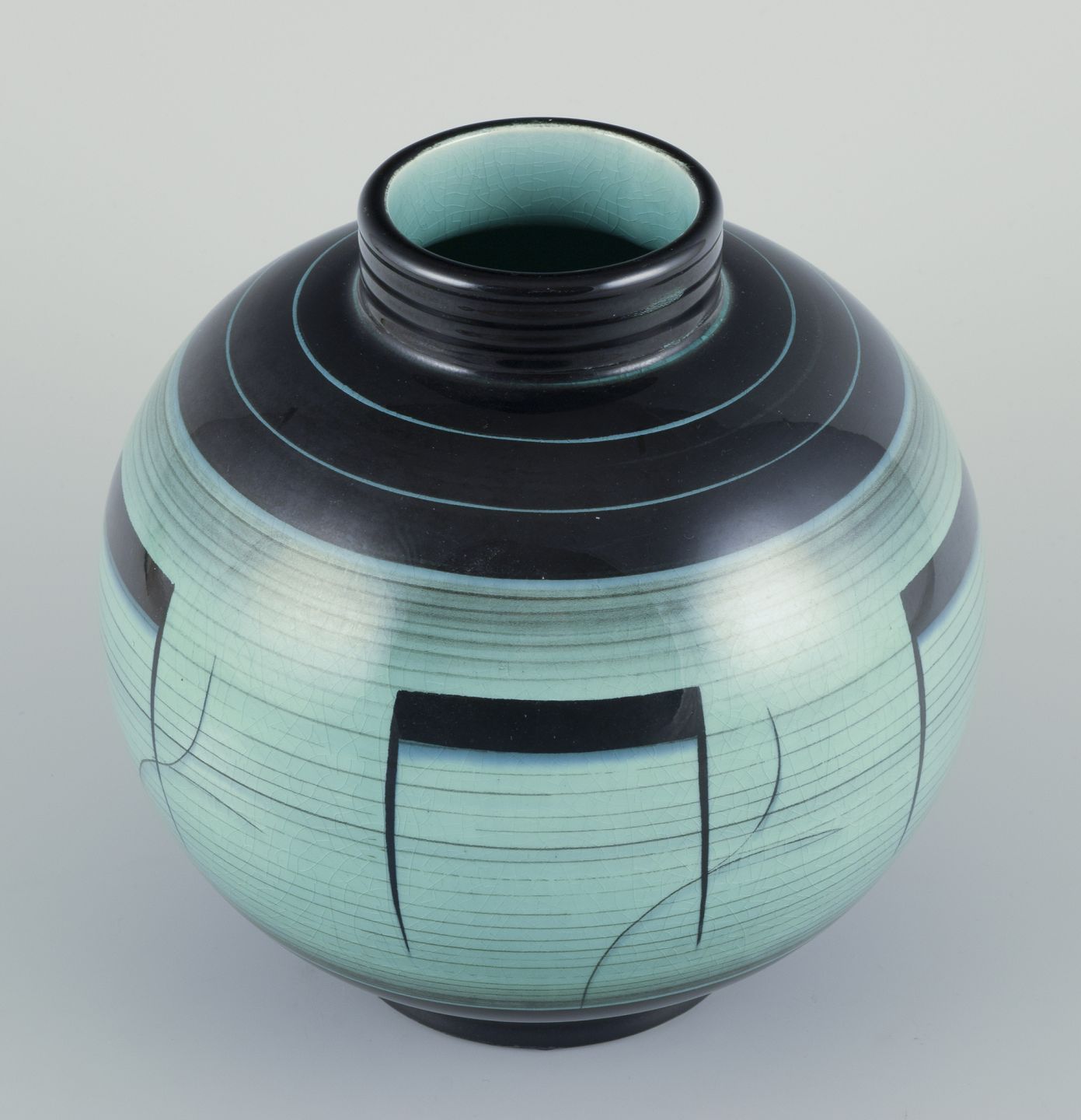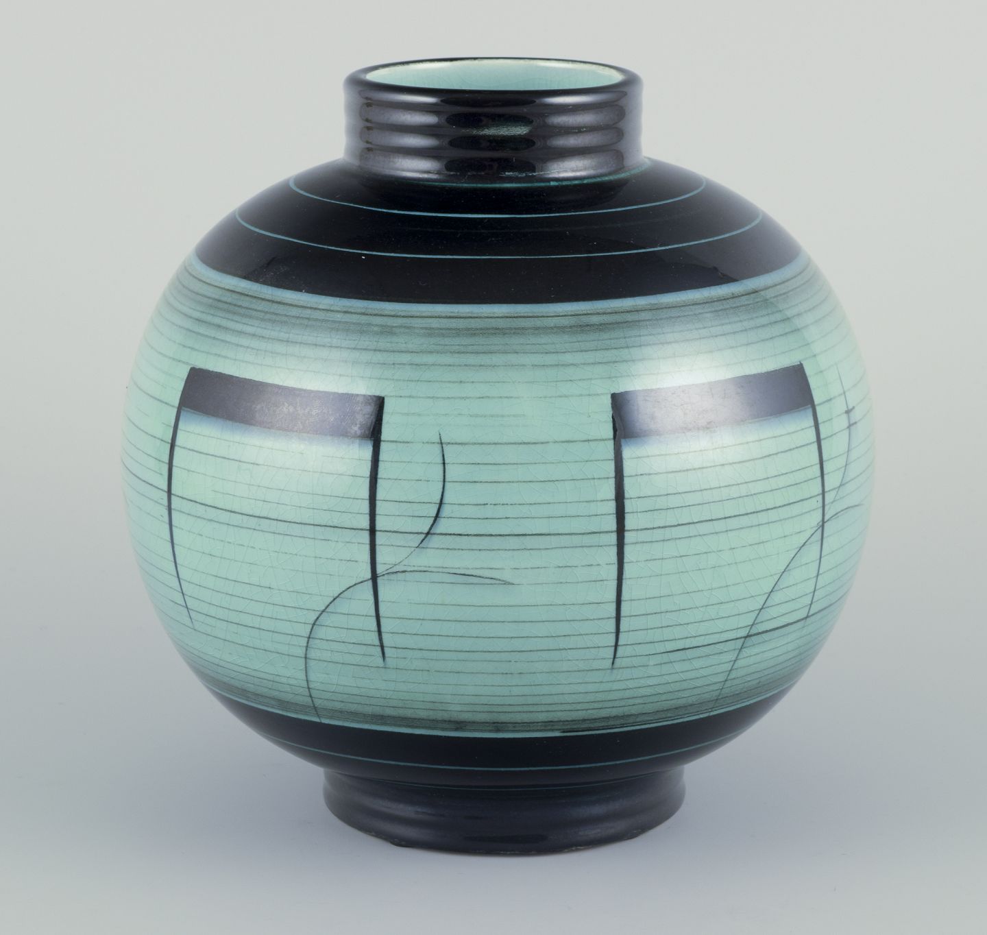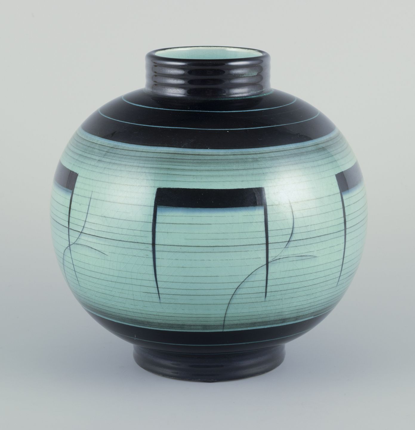 Large and round vase in glazed faience. Art Deco. Bauhaus inspired decoration.