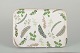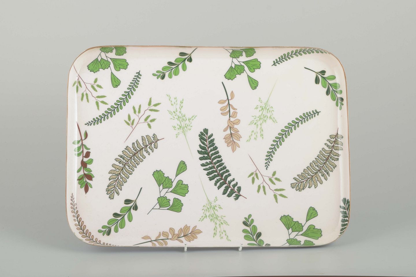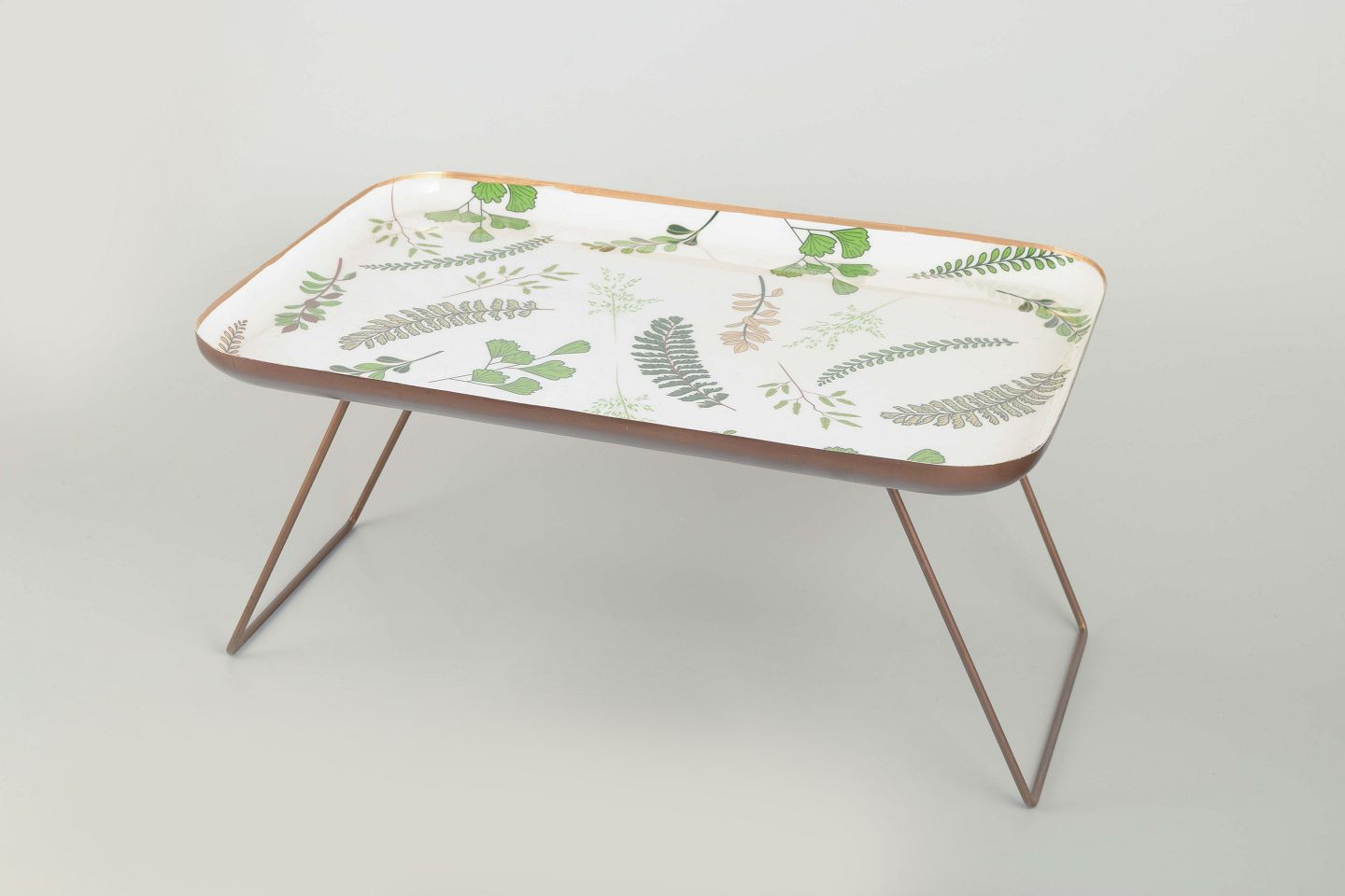 Rectangular tray table with wooden frame and metal legs. The tray decorated with Josef Frank’s characteristic botanical pattern featuring green leaves and ferns on a light background.