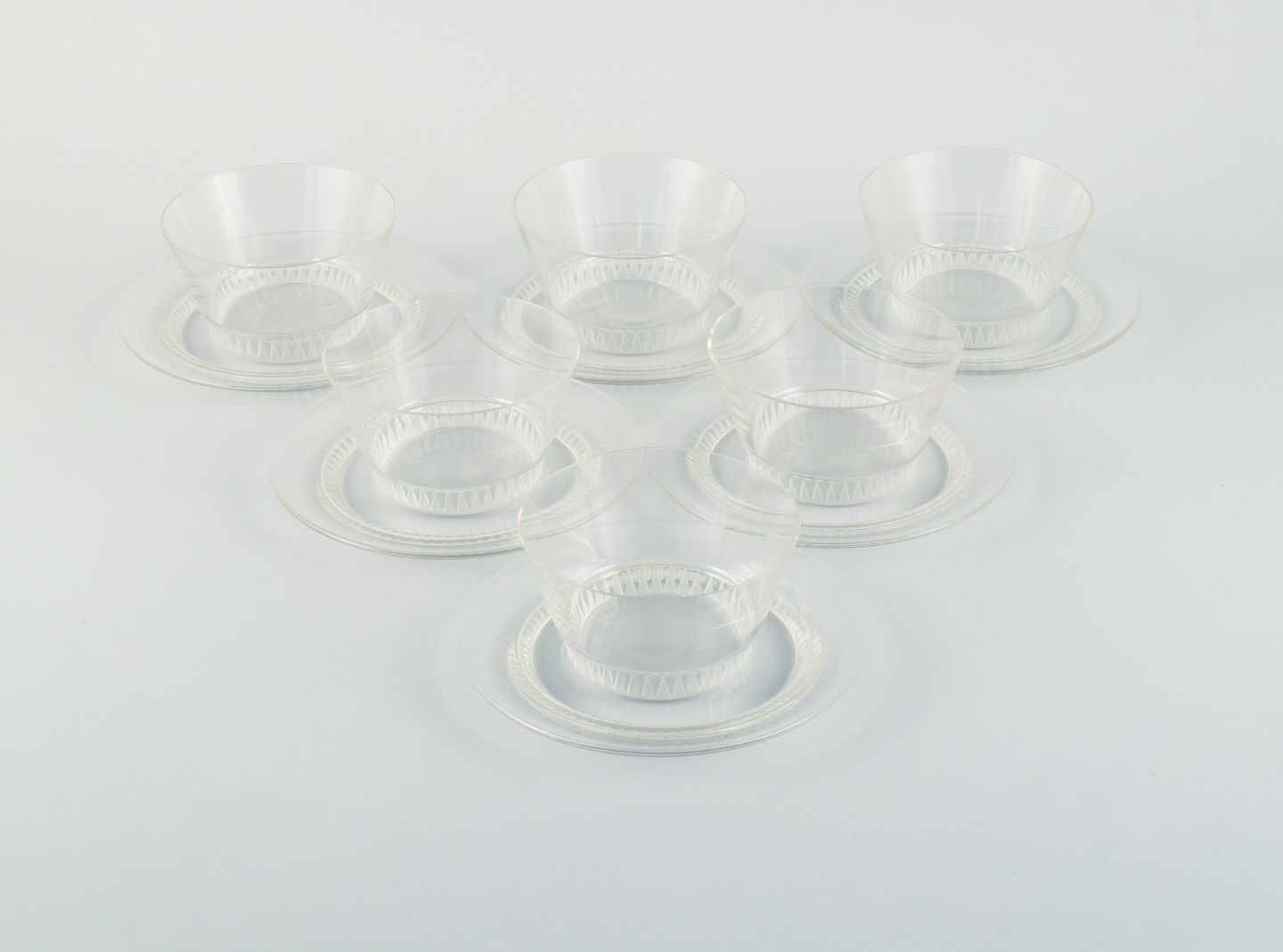 René Laligue, et sæt på seks "Bourgueil" skylleskåle med tilhørende undertallerkner.