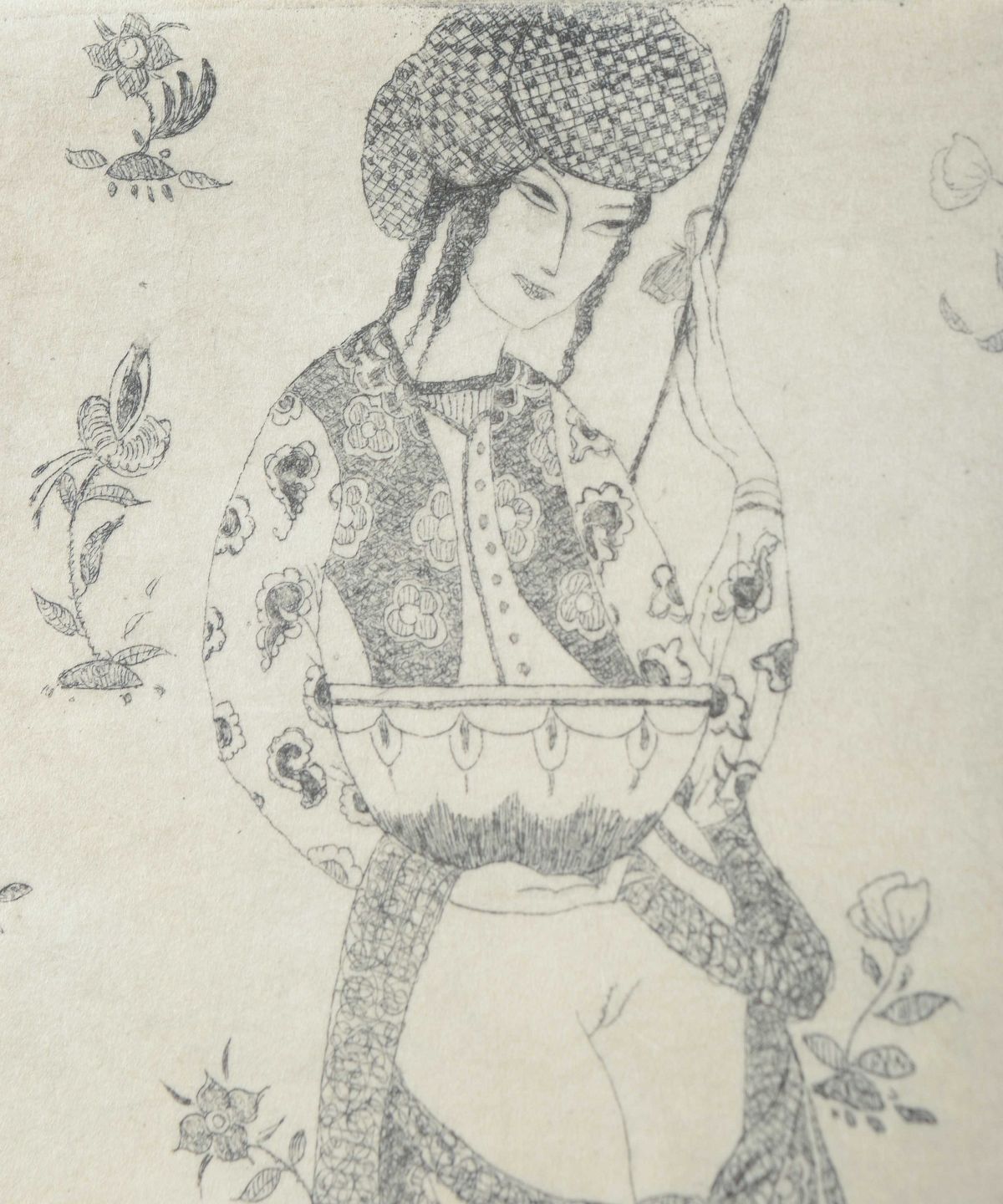 Dette raffinerede blad af Gerhard Henning demonstrerer kunstnerens evne til at forene en næsten ornamental ornamentik med en udpræget sans for linjeføringens rytmiske elegance. Figuren, med sine orientalsk inspirerede dragtdetaljer, træder frem som et symbol på en tid, hvor europæisk kunst søgte mod det eksotiske og det dekorative som modbillede til den strenge naturalisme.