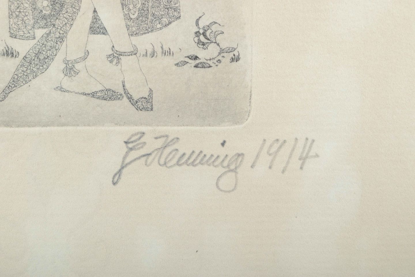 Gerhard Henning (1880–1967) indtager en central position i det skandinaviske kunstliv i det 20. århundredes første halvdel, især gennem sit virke som billedhugger og keramisk formgiver. Han var tilknyttet Royal Copenhagen, hvor han skabte nogle af fabrikkens mest ikoniske porcelænsfigurer, kendetegnet ved en subtil sanselighed og en fin balance mellem klassisk idealisme og moderne formsprog. Ved siden af sine tredimensionelle arbejder dyrkede Henning grafikken, hvor han ofte kombinerede dekorativ stringens med en drømmende, næsten poetisk figurverden.
