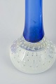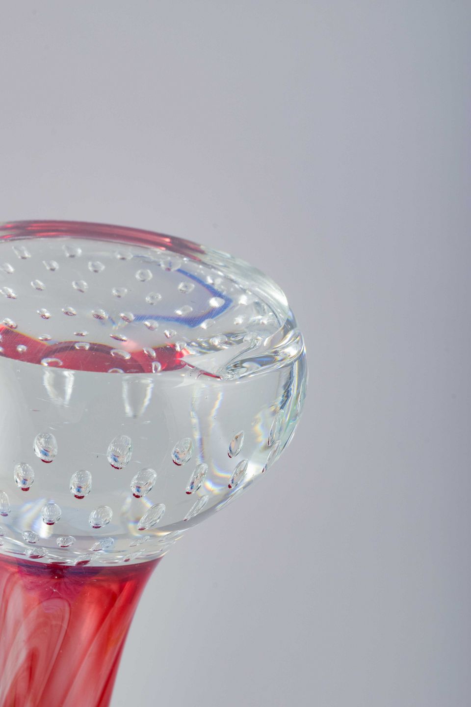 Et sæt dekorative glasvaser, én i blå og én i rød glasmasse, med højt slankt korpus og foldet åbning. Basen udført i klart glas med indfangede bobler (controlled bubbles). Fremstillet i Sverige, 1960–70’erne.