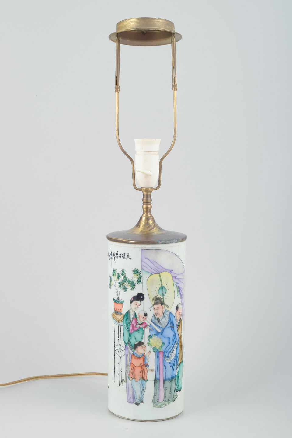 Kinesisk porcelænsbordlampe af cylinderformet vase. Sen Qing / Republikperioden (ca. 1900–1930).