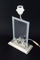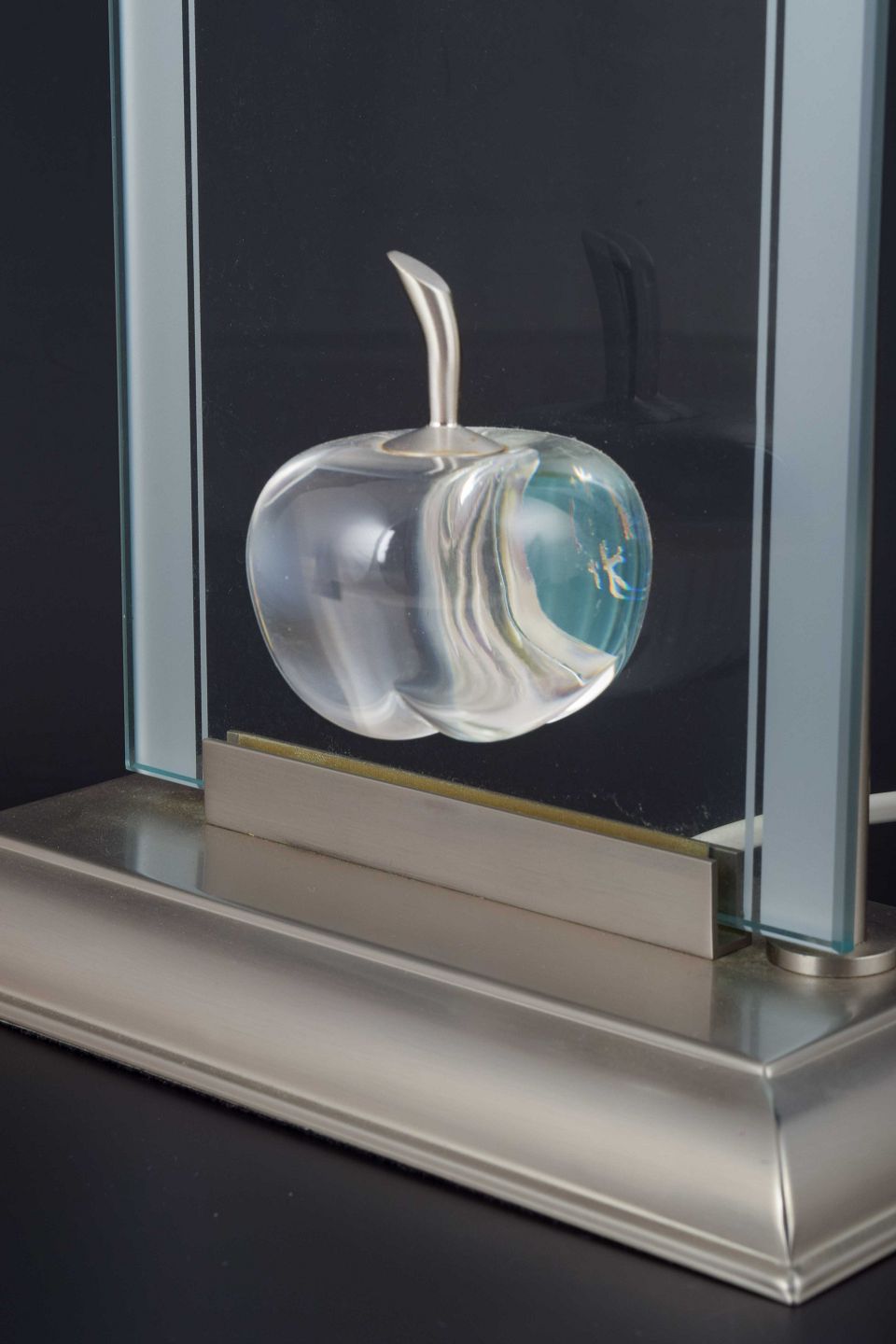 Bordlampe med rektangulær glasplade og indlagt skulpturel glasæble med stilk i metal, monteret i sokkel af børstet metal.