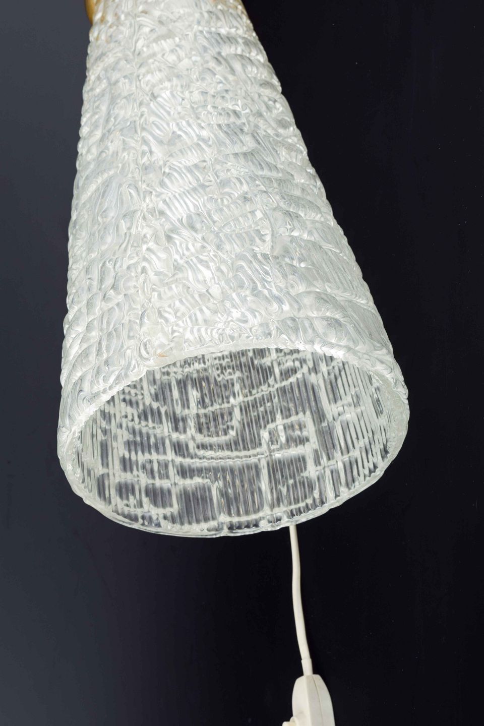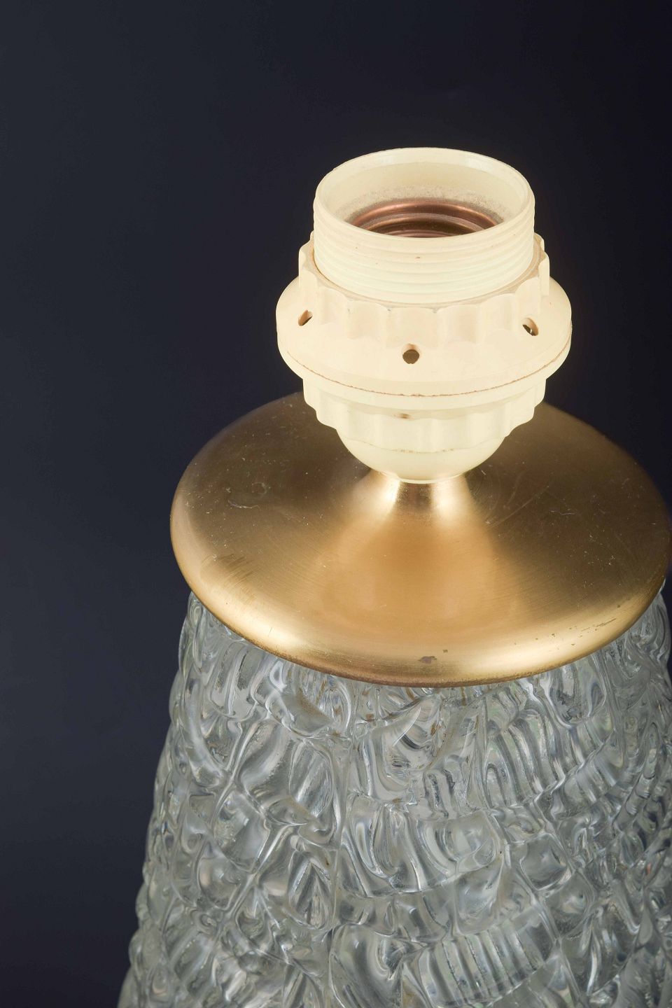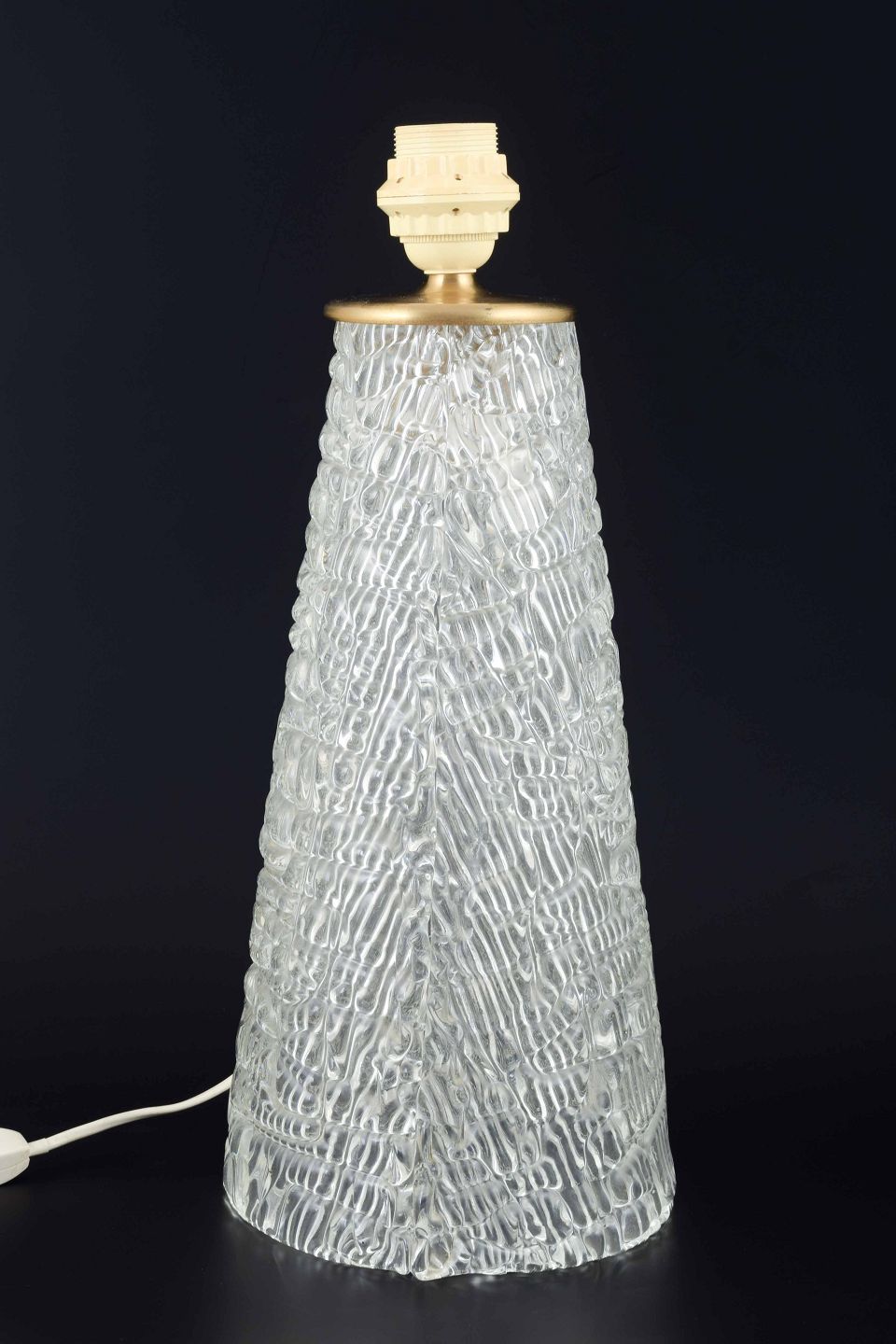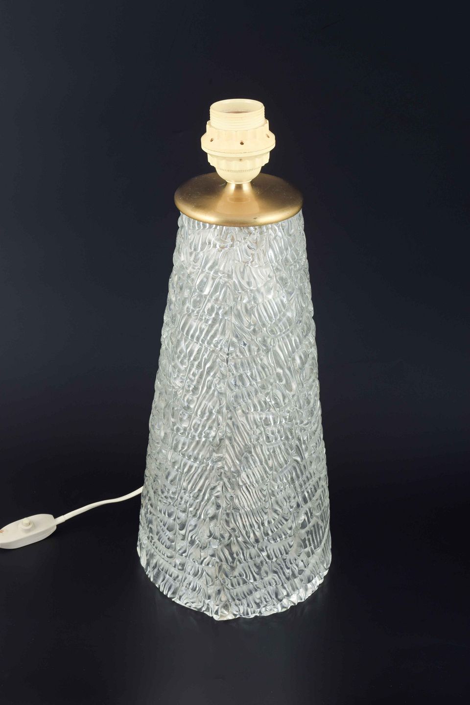 Konisk bordlampefod i formblæst, klart krystalglas med struktureret overflade, monteret med messingtop og fatning i plast.