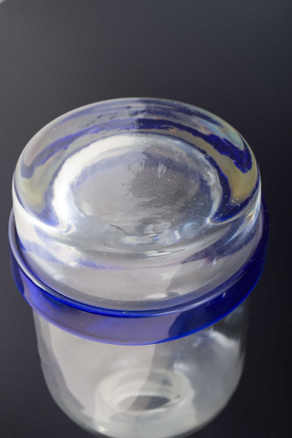 Karaffel med prop i klart og blåt glas. Formentlig Murano, Italien, midt 1900-tallet.