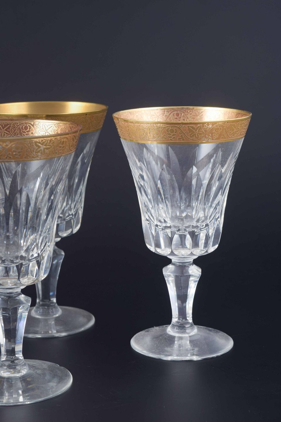 Facetslebne krystalglas på balusterfod, afsluttet med bredt guldbelagt bånd med indgraveret dekor i form af stiliserede blomster- og rankemønstre. Denne type glas var populære i midten af 1900-tallet, hvor krystal med forgyldte detaljer blev anset som både festlige og repræsentative og ofte indgik i komplette services til vin og likør.