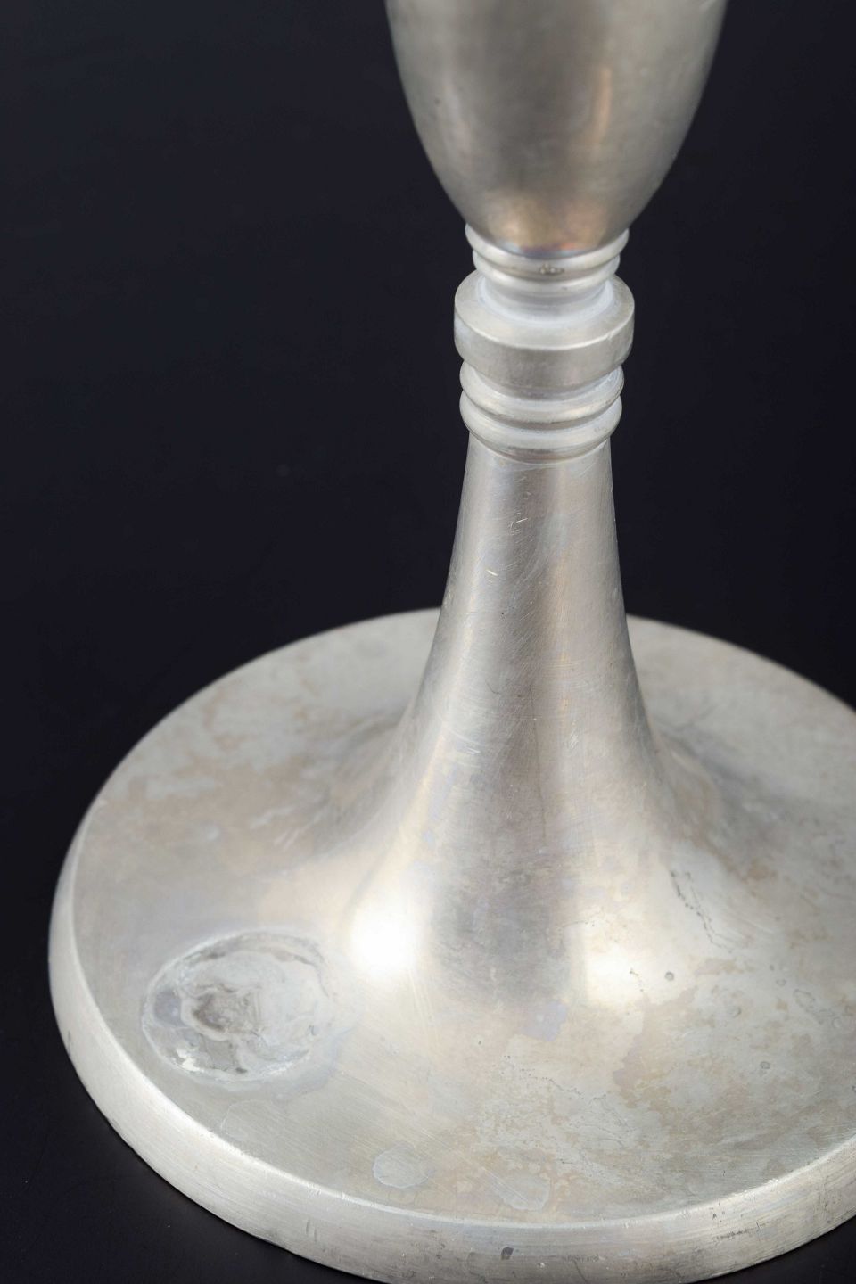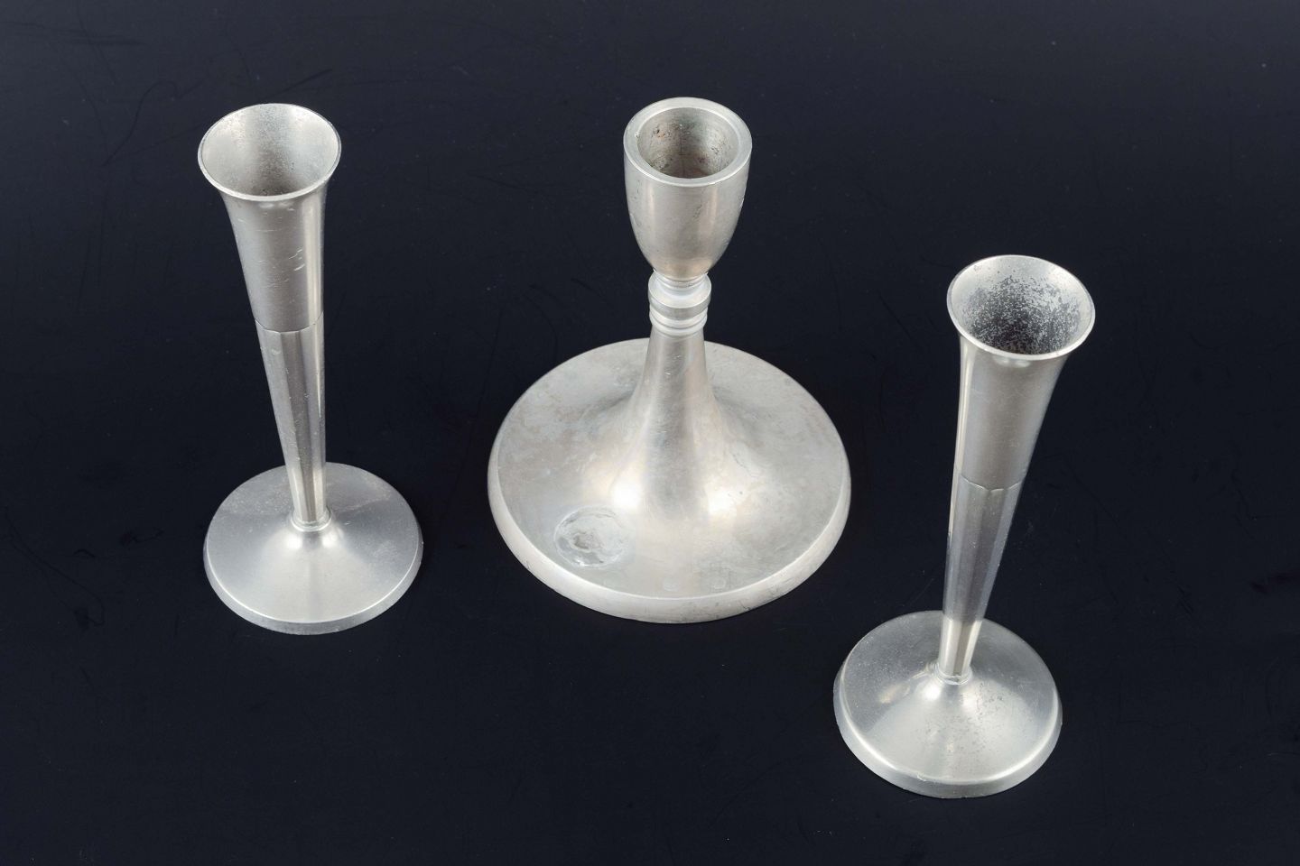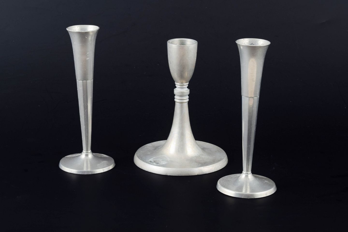 One Danish candlestick by Just Andersen, Denmark, and two slender examples stamped Selangor Pewter, Malaysia.