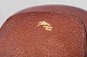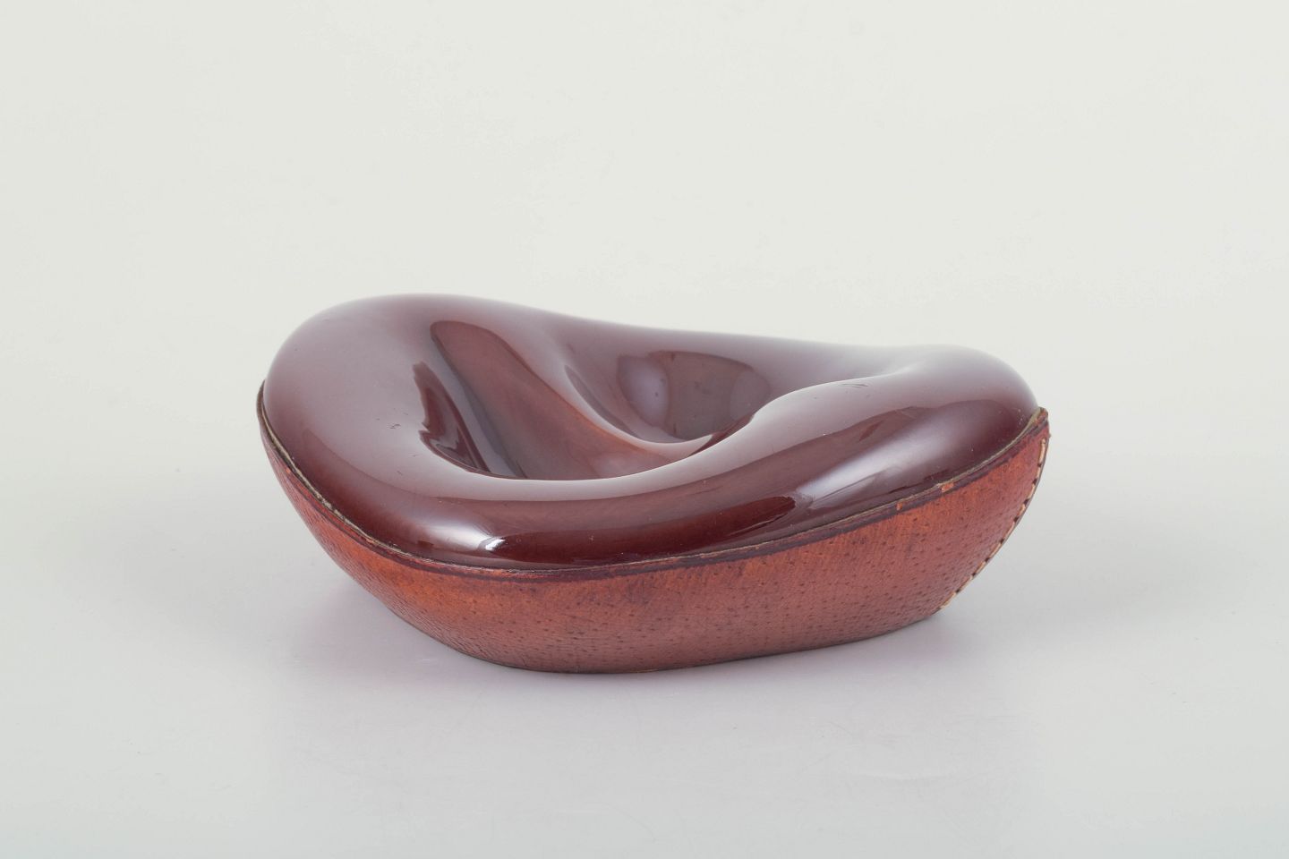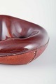 Organisk formet skål i keramik med dyb bordeaux glasur. Monteret med læderbetrukket underside, stemplet med Longchamp-mærke.
