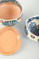 Flødekande og sukkerskål i Marguerite-stellet, glaseret keramik hånddekoreret med polykrome blomster- og rankemotiver i blå og rødlig glasur på lys bund.
