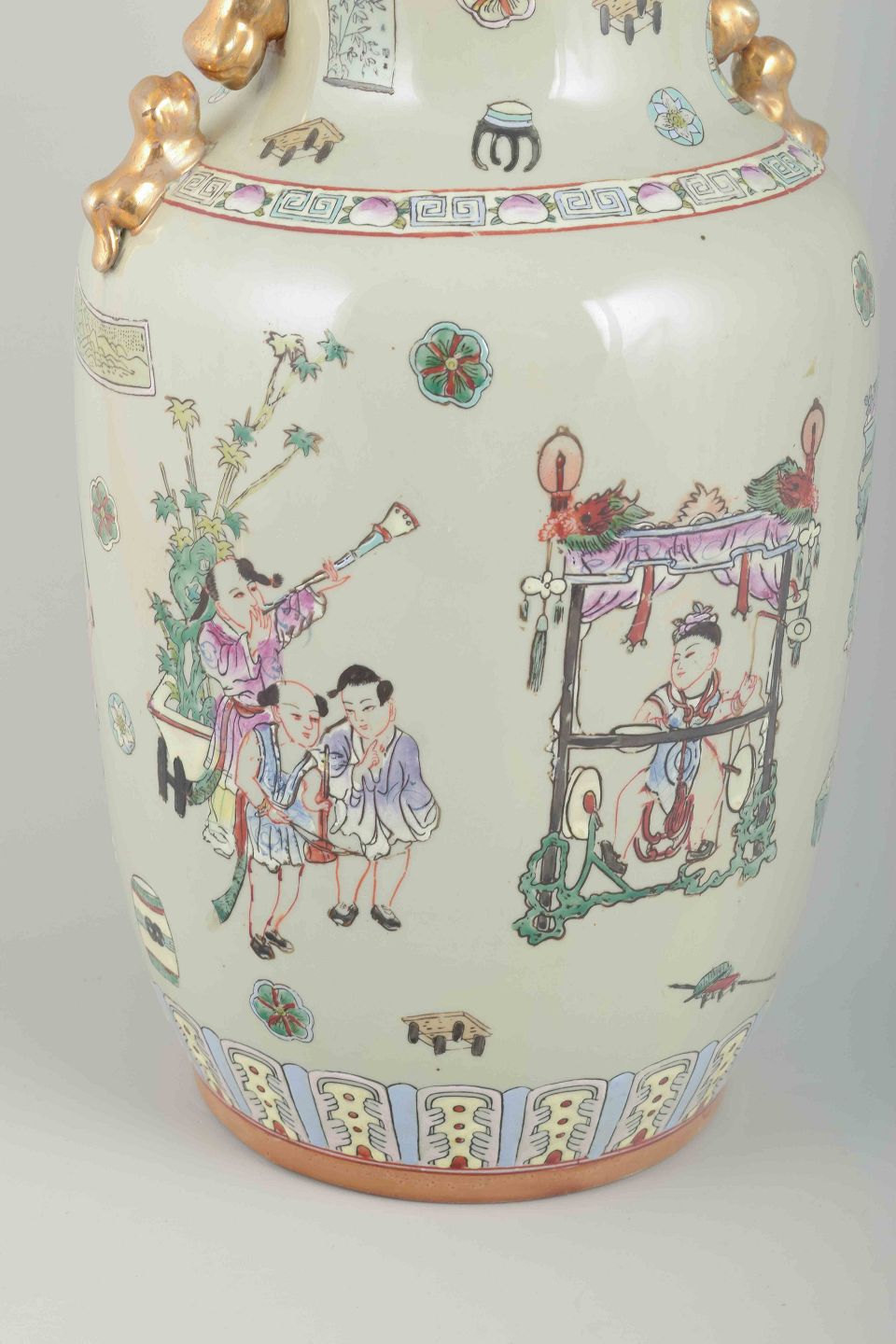 Kinesiske porcelænsvaser fra det 20. århundrede kombinerer traditionelle dekorationsformer med senere tiders produktionsteknikker. Scenedekorationer med figurer hentet fra klassisk kinesisk kulturhistorie er typiske, og guldfarvede løvehanke understreger forbindelsen til ældre kejserlige forlæg.