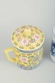 Cylindrisk formede porcelænskopper med hank, hver med låg og indvendig si. Den ene dekoreret på gul bund med flerfarvet emaljemaling og kinesiske skrifttegn, den anden i blå/hvid dekoration med fiskemotiv og kalligrafi.