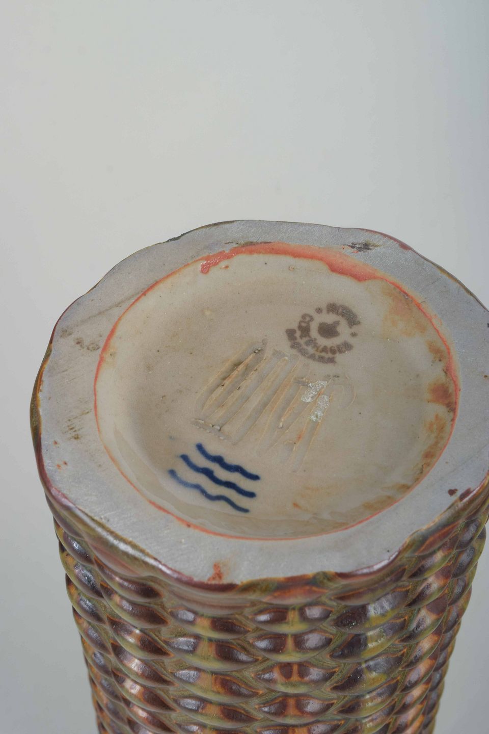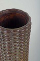 Organisk formet cylindrisk vase i drejet stentøj med karakteristisk knopmønster og flerfarvet glasur i grønne og brune nuancer.