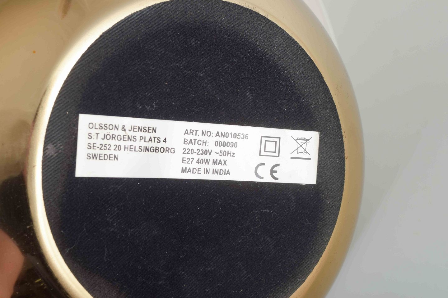 Olsson & Jensen er et svensk designfirma med base i Helsingborg, kendt for deres kombination af moderne og klassiske former i boligindretning. Lampen er produceret i Indien og forener skandinavisk enkelhed med international produktion, hvilket giver et tidssvarende udtryk med et strejf af retroinspiration.