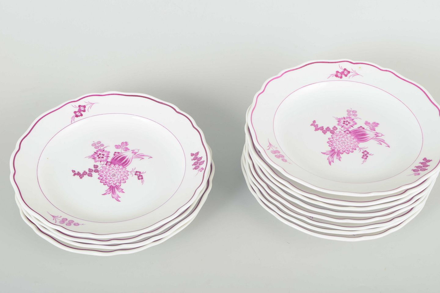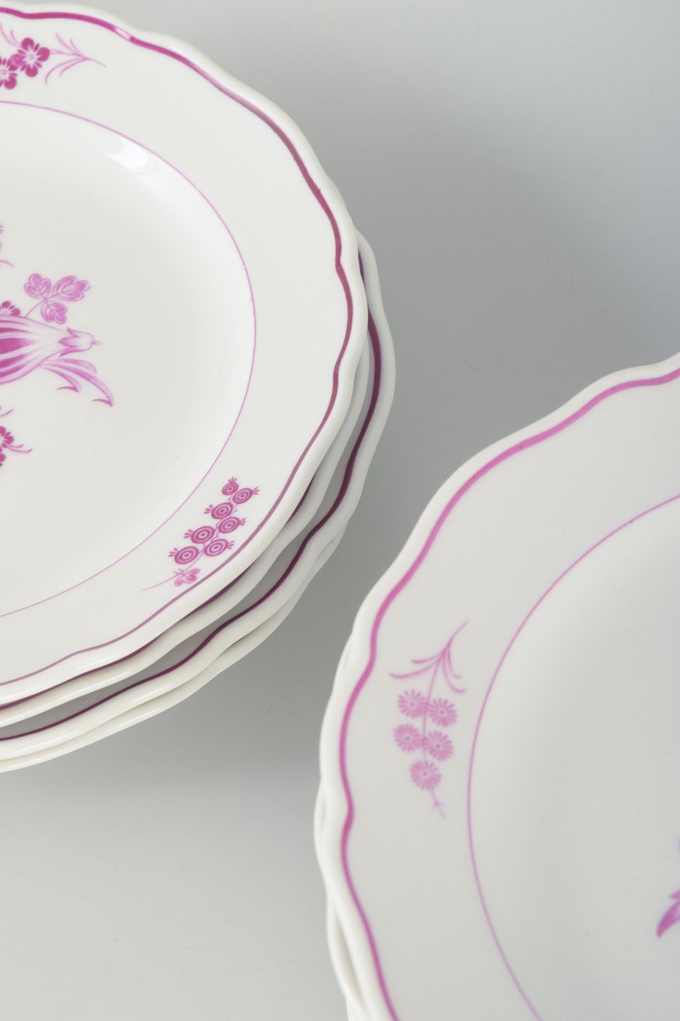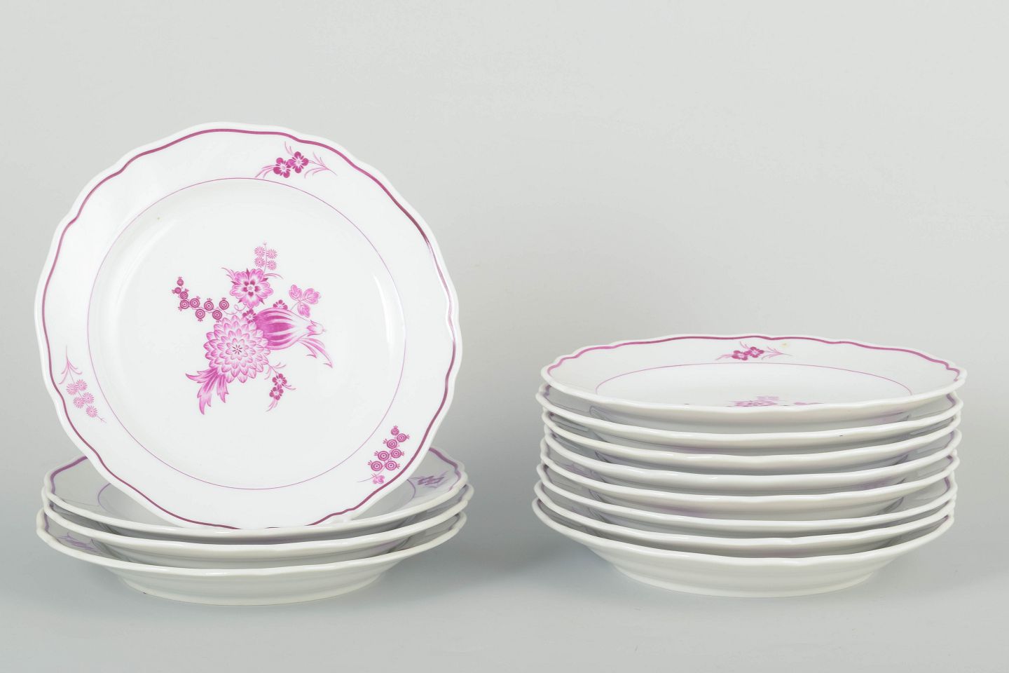 Set of twelve deep porcelain plates, hand-painted with floral compositions in purple/pink tones. Classic scalloped rims with simple painted detailing.