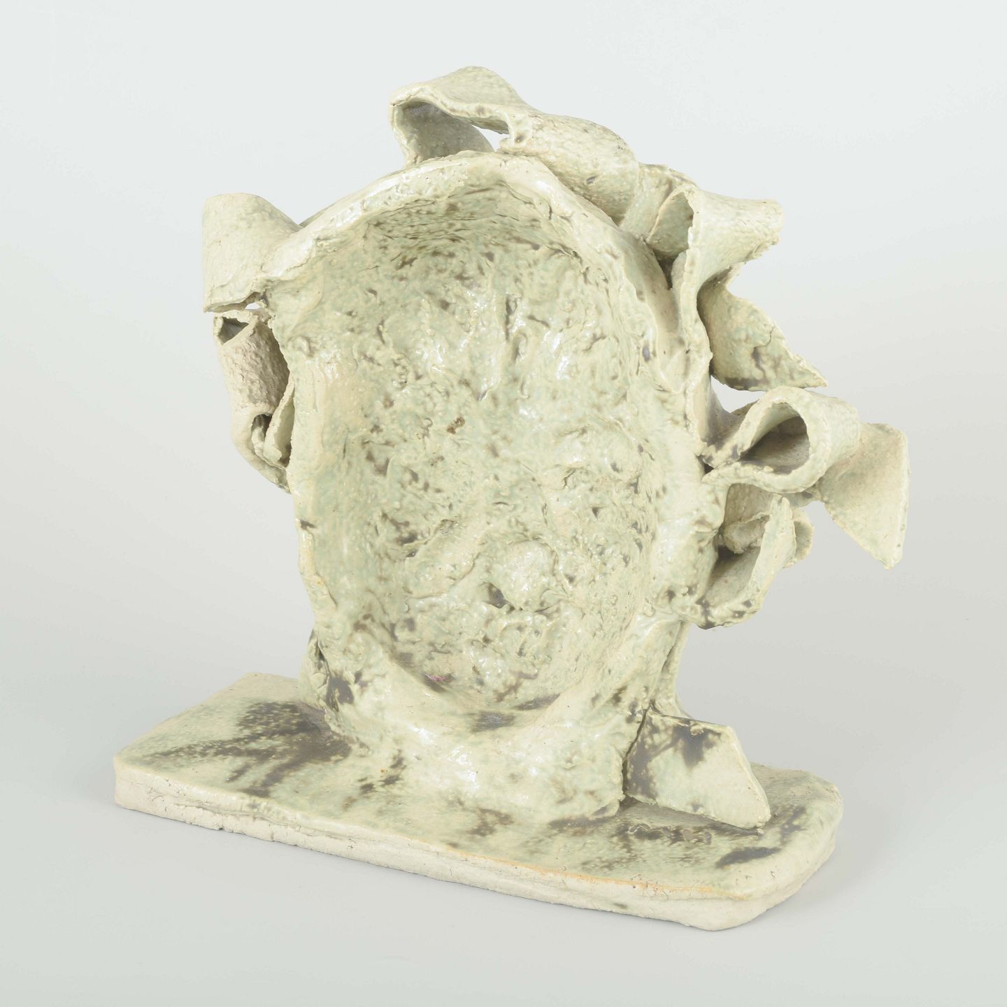 Unik håndformet hovedskulptur i stentøj med lys grønlig glasur og mørke kontraster. De bølgende, foldelignende former omkring ansigtet giver værket et ekspressivt og næsten surrealistisk udtryk. Signeret MH i leret.