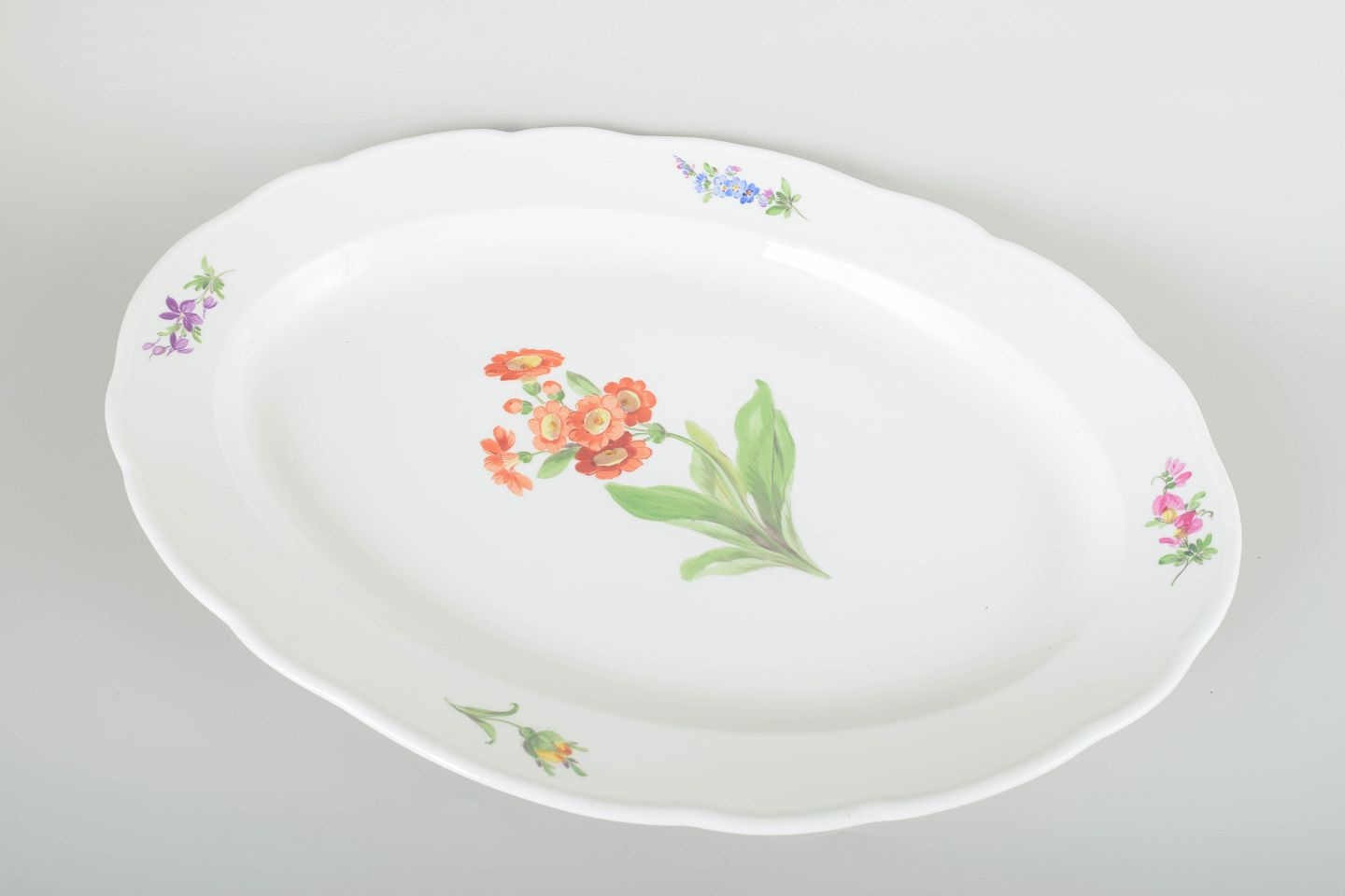 Elegant porcelain serving dish, hand-painted with multicoloured floral decorations. Classic scalloped rim with relief and refined detailing.