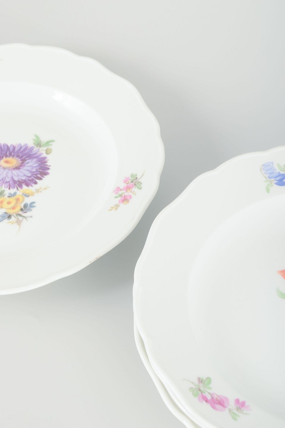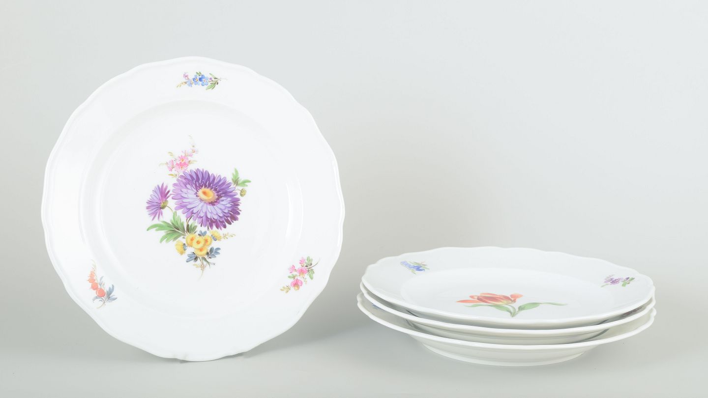 Four porcelain plates, hand-painted with multicoloured floral decorations. Classic scalloped rim with relief and delicate detailing.