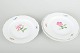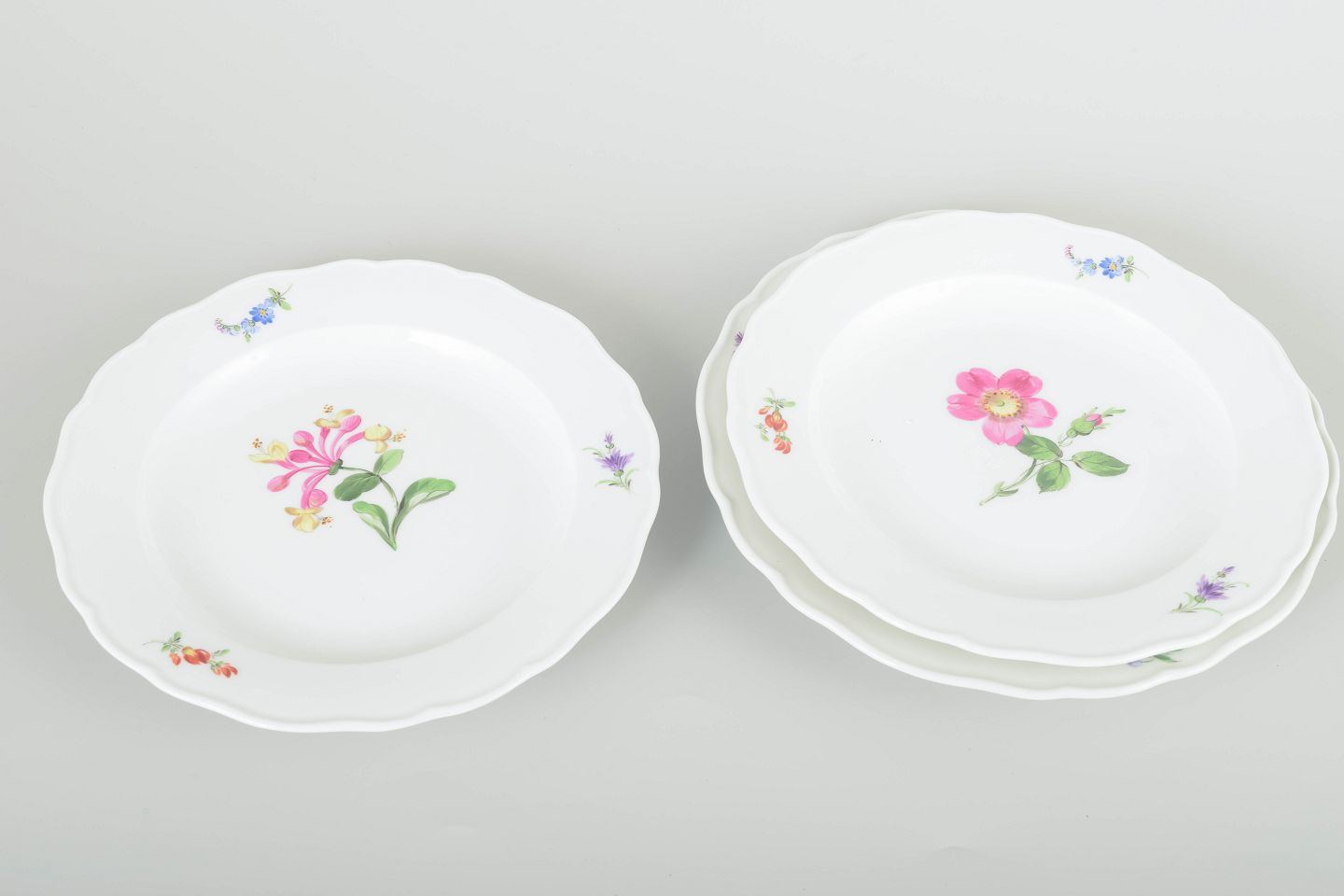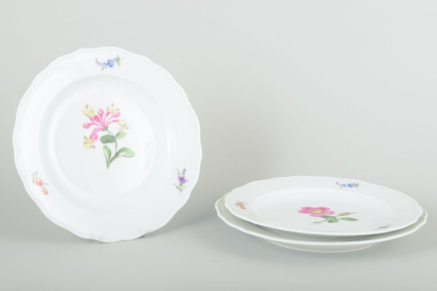 Three porcelain plates, hand-painted with multicoloured floral decorations. Classic scalloped rim with relief and delicate detailing.