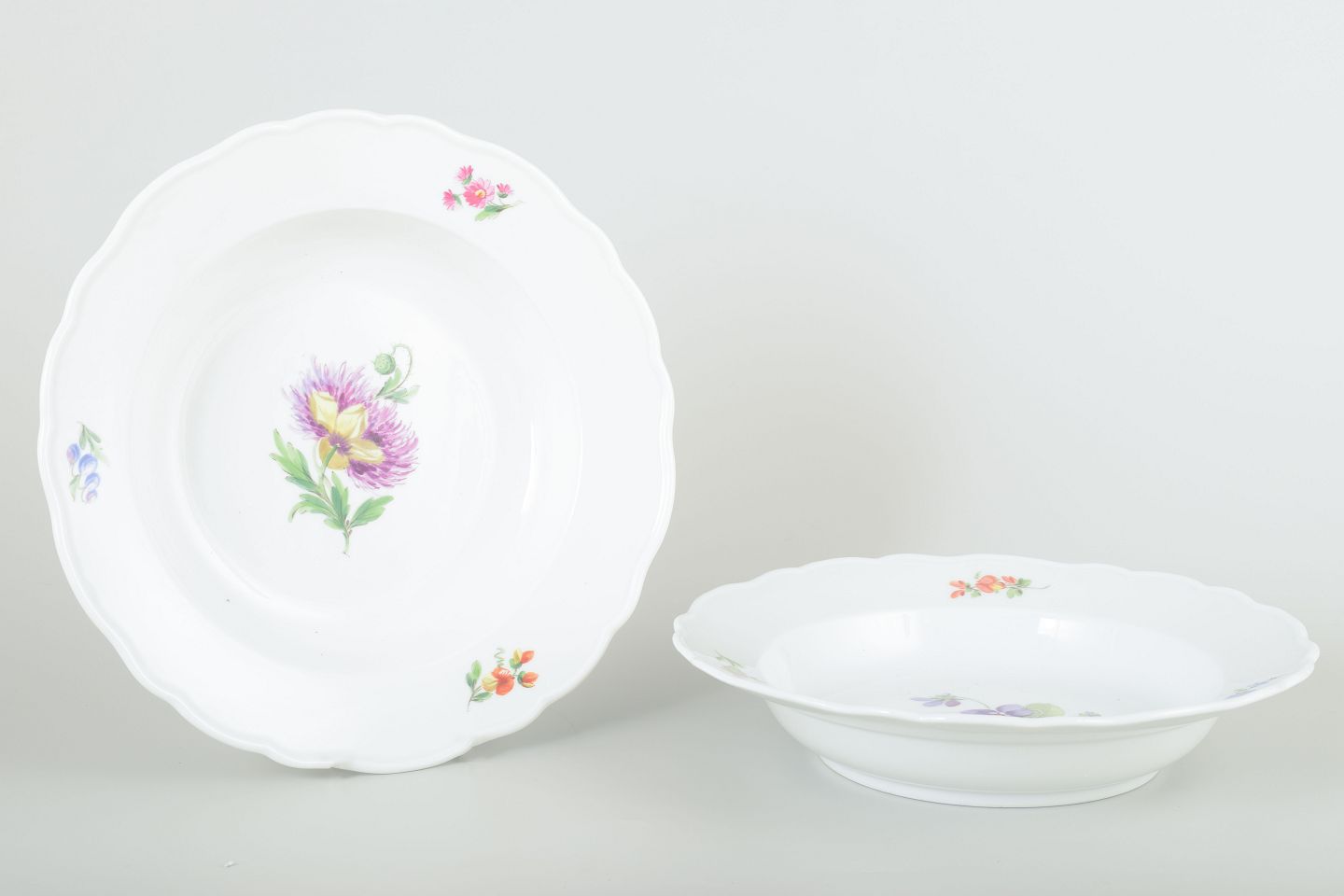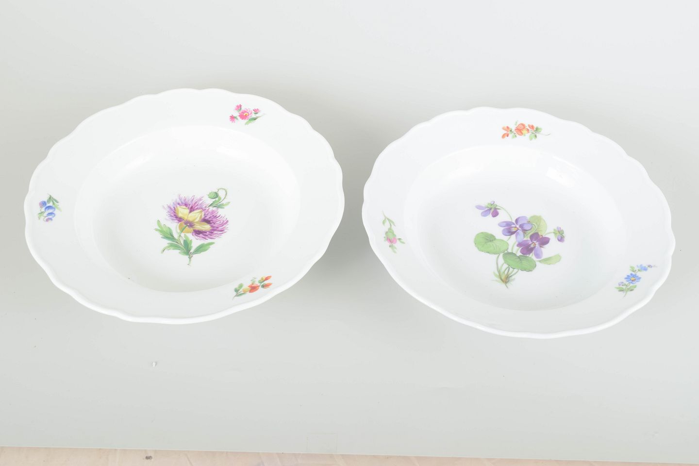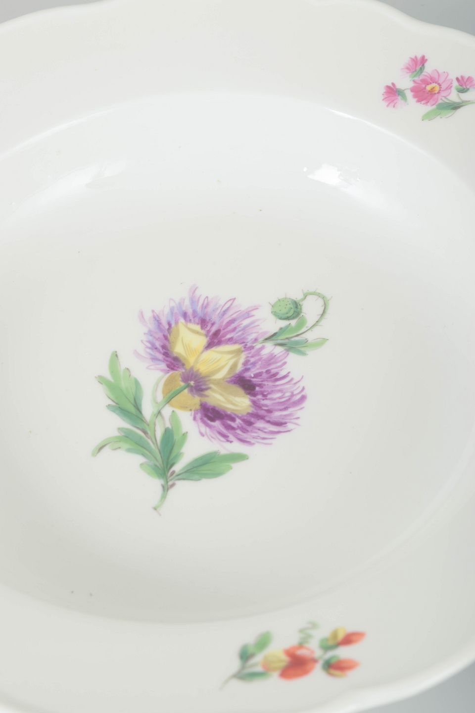 Two porcelain soup plates, hand-painted with multicoloured floral decorations. Classic scalloped rim with relief and delicate detailing.
