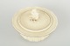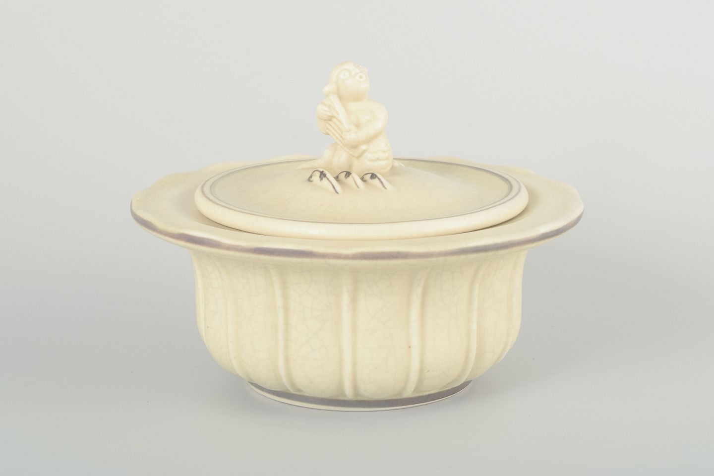 Art Deco lågkrukke i fajance med reliefdekoreret korpus og låg med figurativ knop forestillende abe. Glasur i klassisk cremefarvet craquelé med let violette skygger. Model nr. 117/138.
