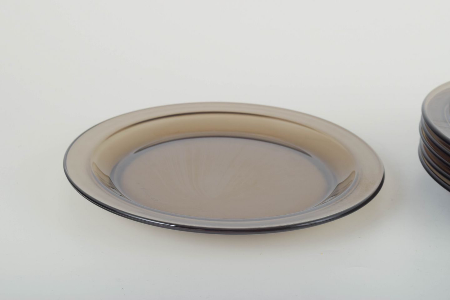 Sæt bestående af seks tallerkener i røgfarvet glas. Klassisk fransk design fra Vereco, kendt for sit funktionelle glas med enkle linjer og varme toner, typisk for 1970’ernes formsprog.