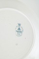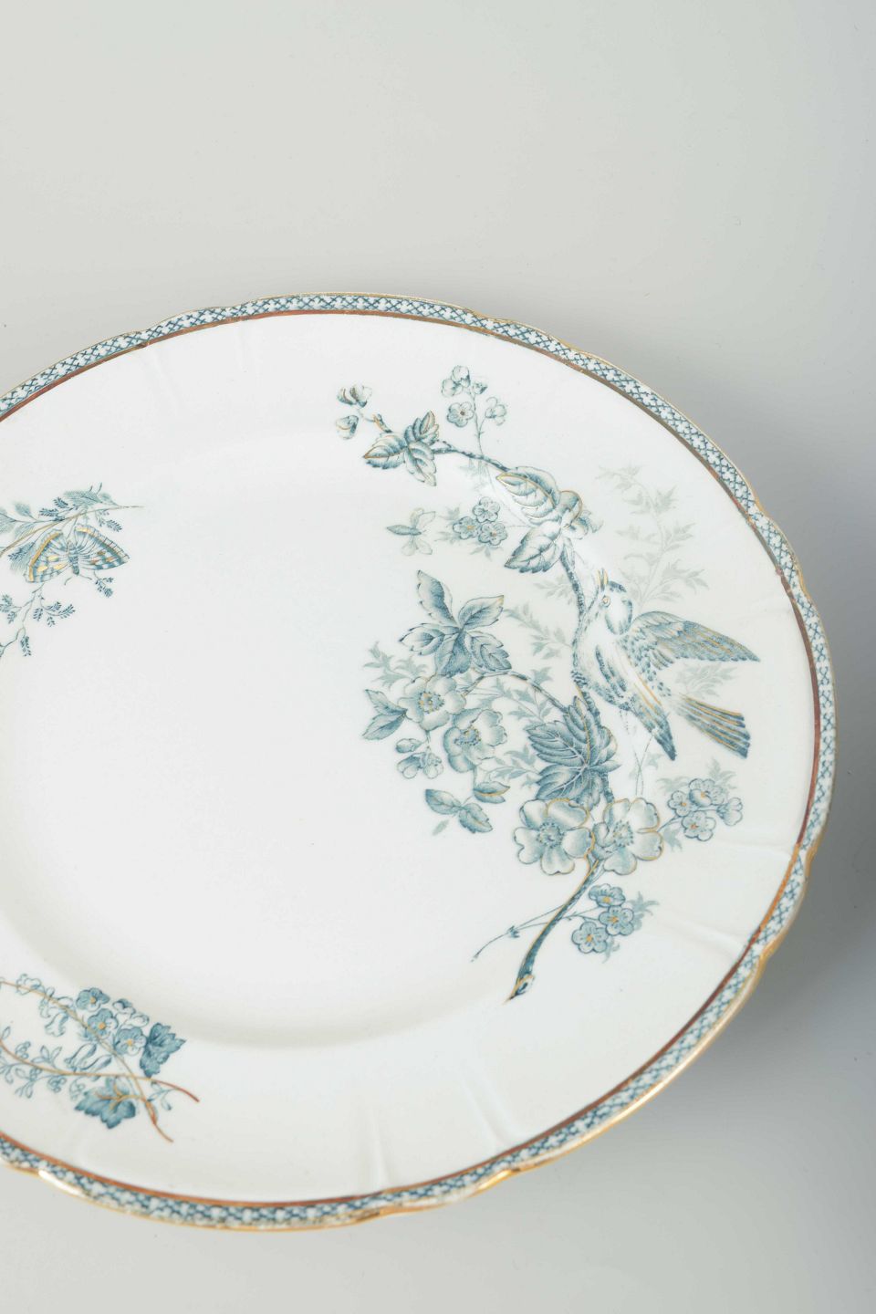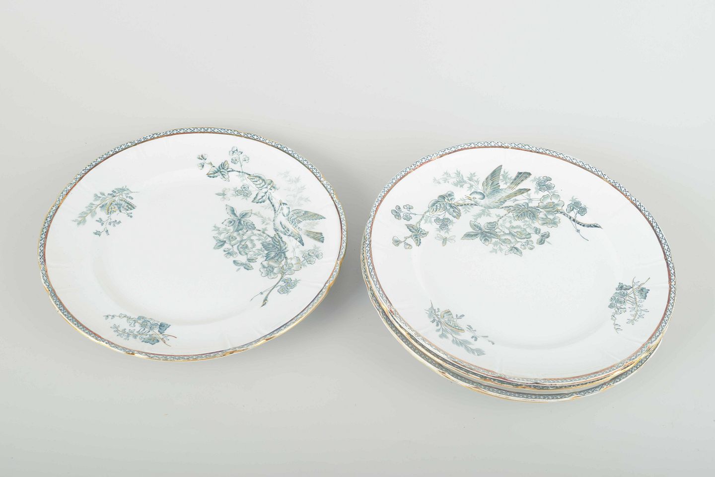 Fem frokosttallerkener i fajance med trykt dekoration af fugl og blomstergren i blågrønne nuancer samt dekorativ bort langs kanten.