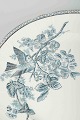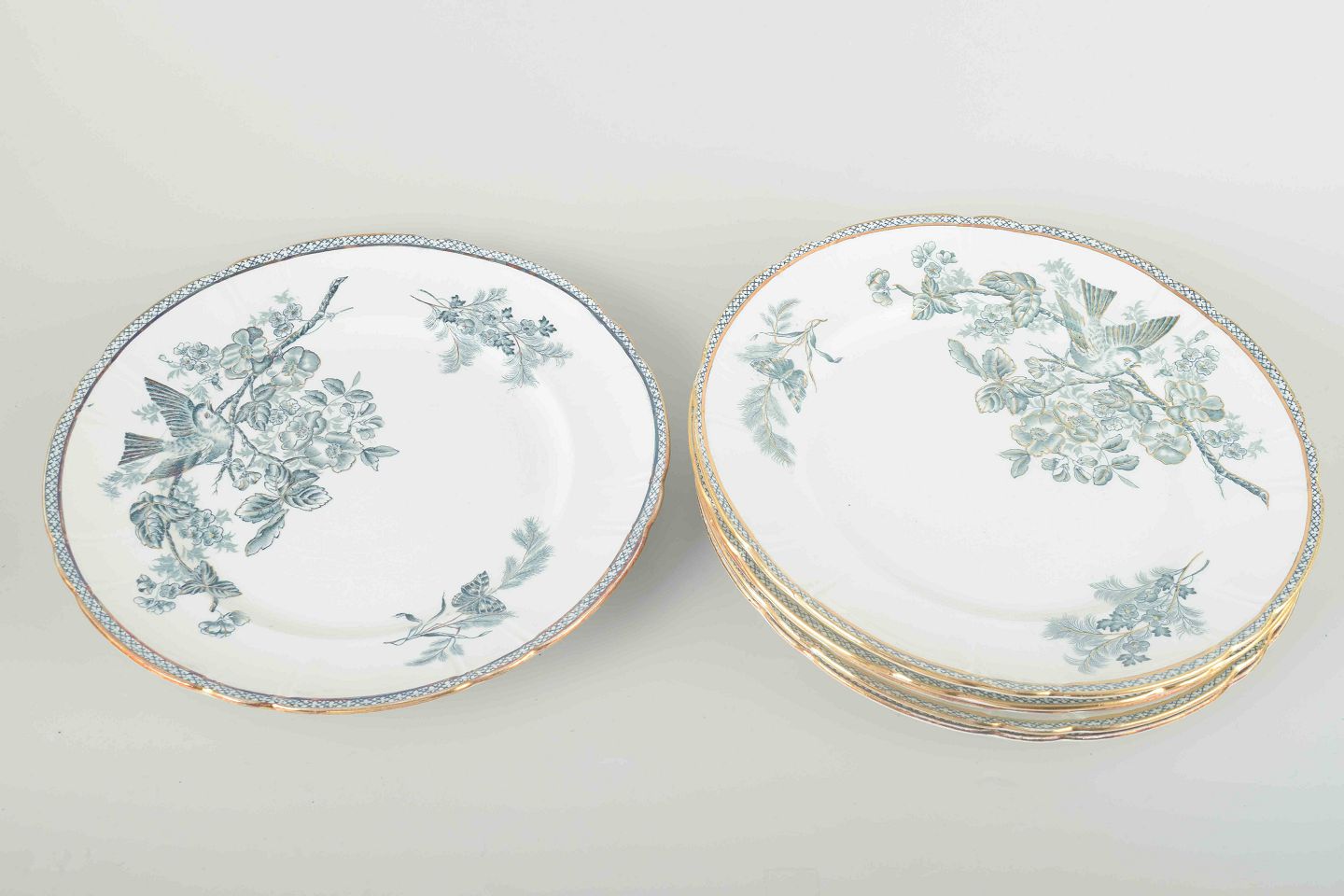 Seks middagstallerkener i fajance med trykt dekoration af fugl og blomstergren i blågrønne nuancer samt dekorativ bort langs kanten.