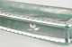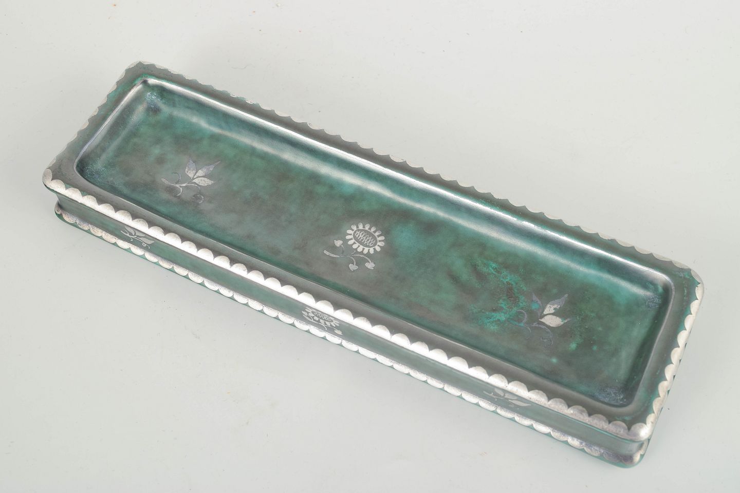 Rektangulær Art Deco penbakke i glaseret stentøj med Gustavsbergs karakteristiske turkisgrønne Argenta-glasur og indlagte sølvdekorationer af stiliserede blomster og bladmotiver.