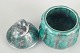 Art Deco lågkrukke i stentøj med turkis glasur og indlagt sølvdekoration, organisk svunget korpus og karakteristisk forhøjet låg med botanisk reliefmotiv og figurativ knop. (Model 851)