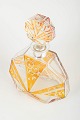 Facetteret Art Deco-karaffel i slebet og dekoreret krystalglas med orange/guldtonet krystalglasur og geometriske ornamenter. Original facetteret prop og sølvmontering.