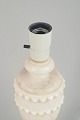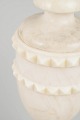 Skulpturel bordlampe i lys marmor med dekorativt bånd af små udskårne takker omkring det øvre midterparti. Den klassiske urneform kombineret med den runde fod giver lampen et blødt, harmonisk og dekorativt udtryk.
