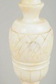 Dekorativ bordlampe i lys marmor med udskårne diamant- og lodrette facetmønstre, der giver lampen et klassisk og elegant formsprog. Den kvadratiske fod og de bløde proportioner understreger lampens skulpturelle karakter.