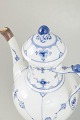 Classic coffee pot in the Blue Fluted Plain pattern, made in a smooth fluted form without lace border and decorated with hand-painted cobalt blue underglaze. The spout is fitted with a silver mount, likely applied to conceal a small chip—an historically common and practical repair that extended the life of the piece.