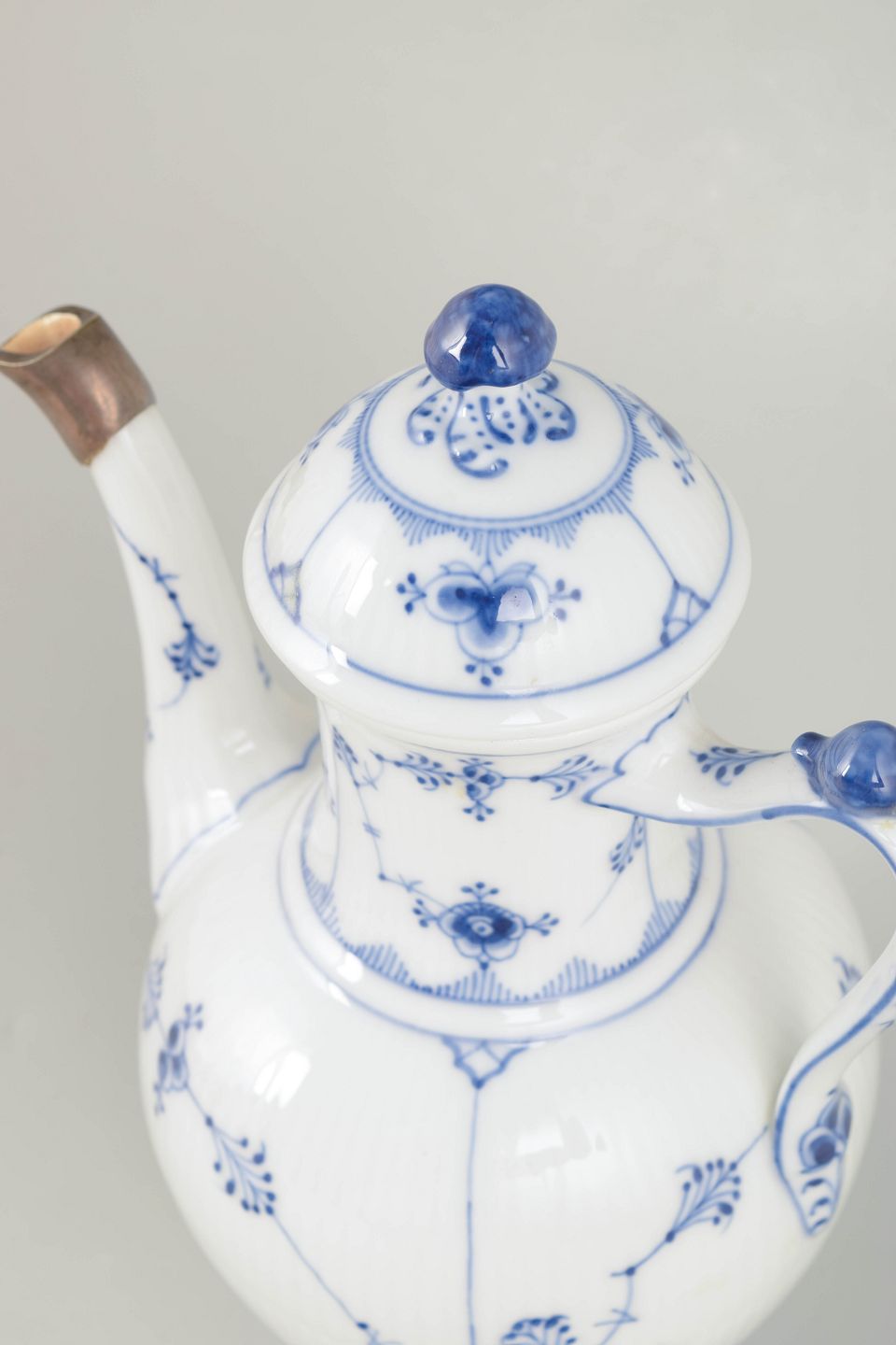 Introduced in 1775, Blue Fluted Plain is Royal Copenhagen’s oldest and most iconic service. In the early 20th century, silver-mounted repairs to spouts were a respected and practical solution, reflecting both craftsmanship and a desire to preserve valuable porcelain. Today, such pieces are appreciated for their authenticity, functionality, and visible history of use.