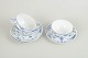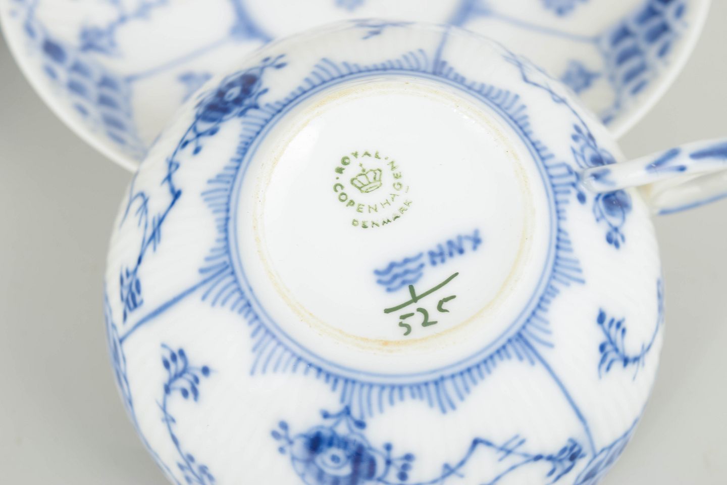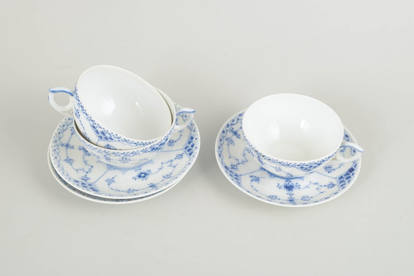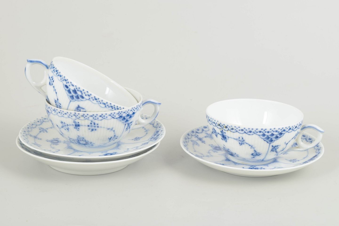 Set of 3 teacups with matching saucers in the Blue Fluted Half Lace pattern. Classic fluted forms with a lace border and hand-painted cobalt blue decoration. A balanced and practical tea set from late production.