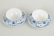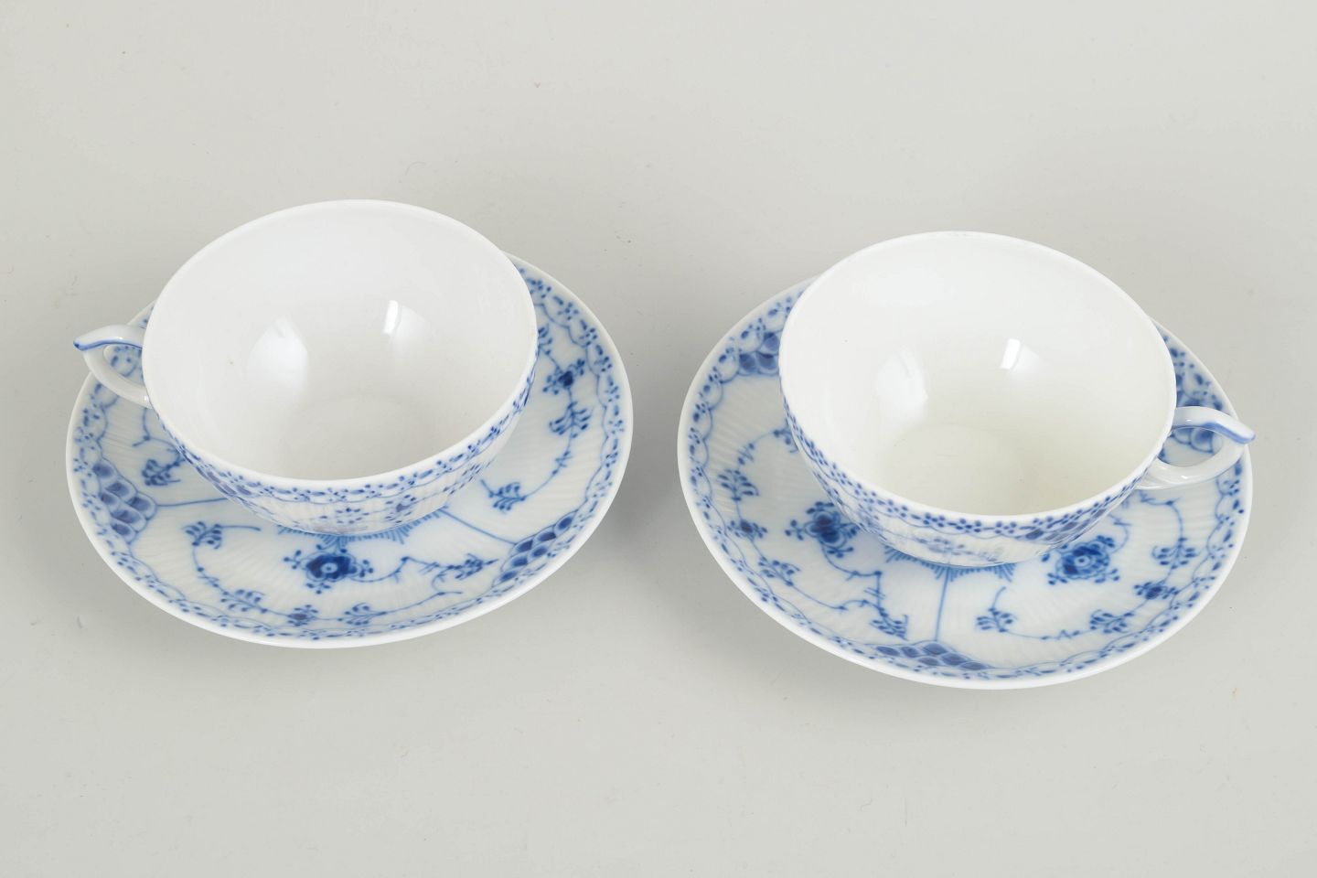 Set of two teacups with matching saucers in the Blue Fluted Half Lace pattern. Classic fluted forms with a lace border and hand-painted cobalt blue decoration. An elegant and practical tea set from late production.
