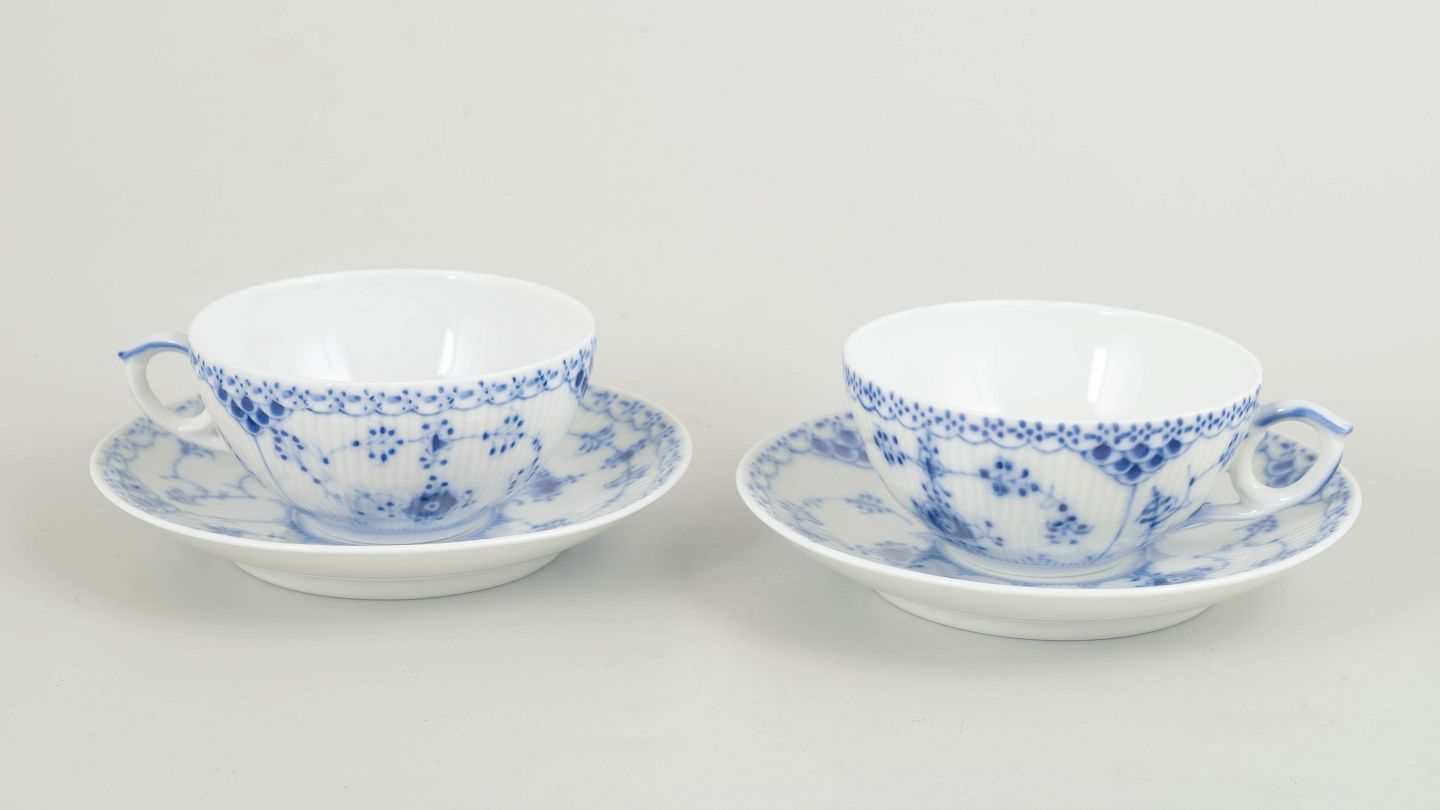 Blue Fluted Half Lace two teacups with saucers, 1980s.