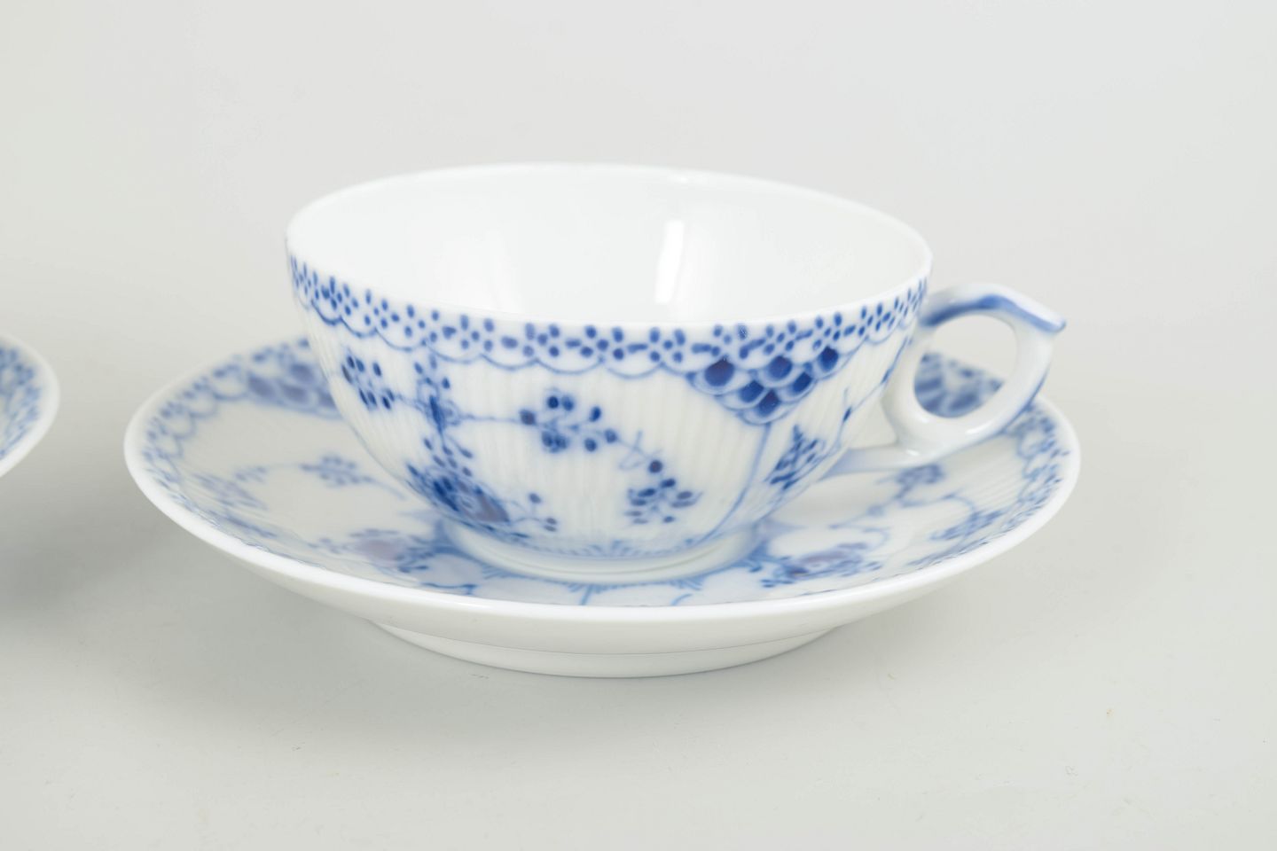 Introduced in 1885, Blue Fluted Half Lace is known as a more decorative interpretation of the classic Blue Fluted Plain service. Teacups and saucers have long been a central element of Royal Copenhagen tea services.