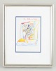 Abstrakt og figurativt sammensat motiv med ekspressive linjer og farvefelter, udført i blandteknik på papir. Kompositionen kombinerer skitseprægede figurer med geometriske former og transparente farvelag. Signeret.