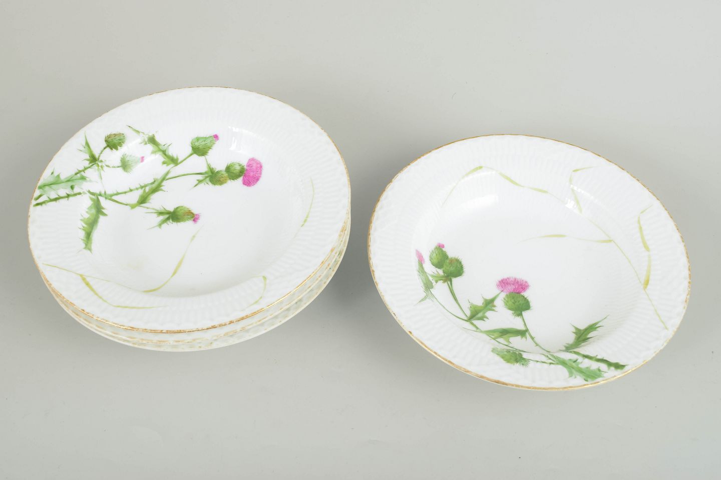 Hand-painted deep porcelain plates decorated with a naturalistic thistle motif and a gilded rim. The plates feature a subtly ribbed surface and display the high level of craftsmanship characteristic of Royal Copenhagen’s production in the second half of the 19th century.