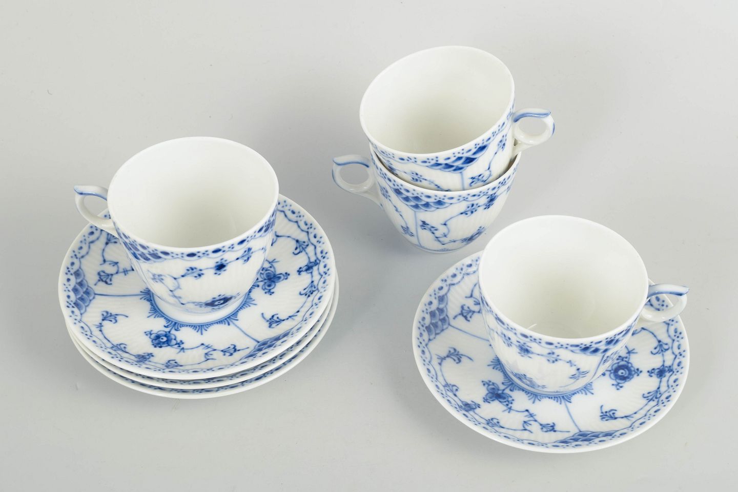 Royal Copenhagen Blue Fluted Half Lace, set of four coffee cups with matching saucers.