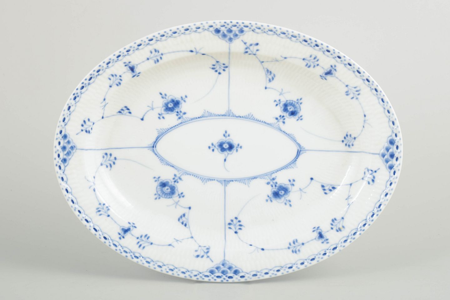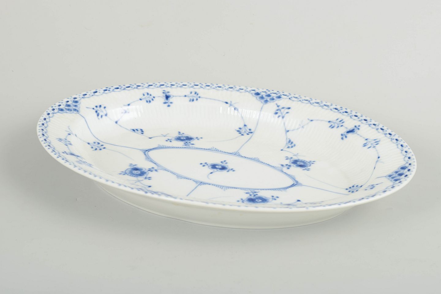Ovalt fad i håndmalet porcelæn fra Musselmalet Halvblonde med klassisk underglasurdekoration i koboltblå, riflede felter og karakteristisk blondekant. Model 1/628. Første sortering. Fremstillet 1964.