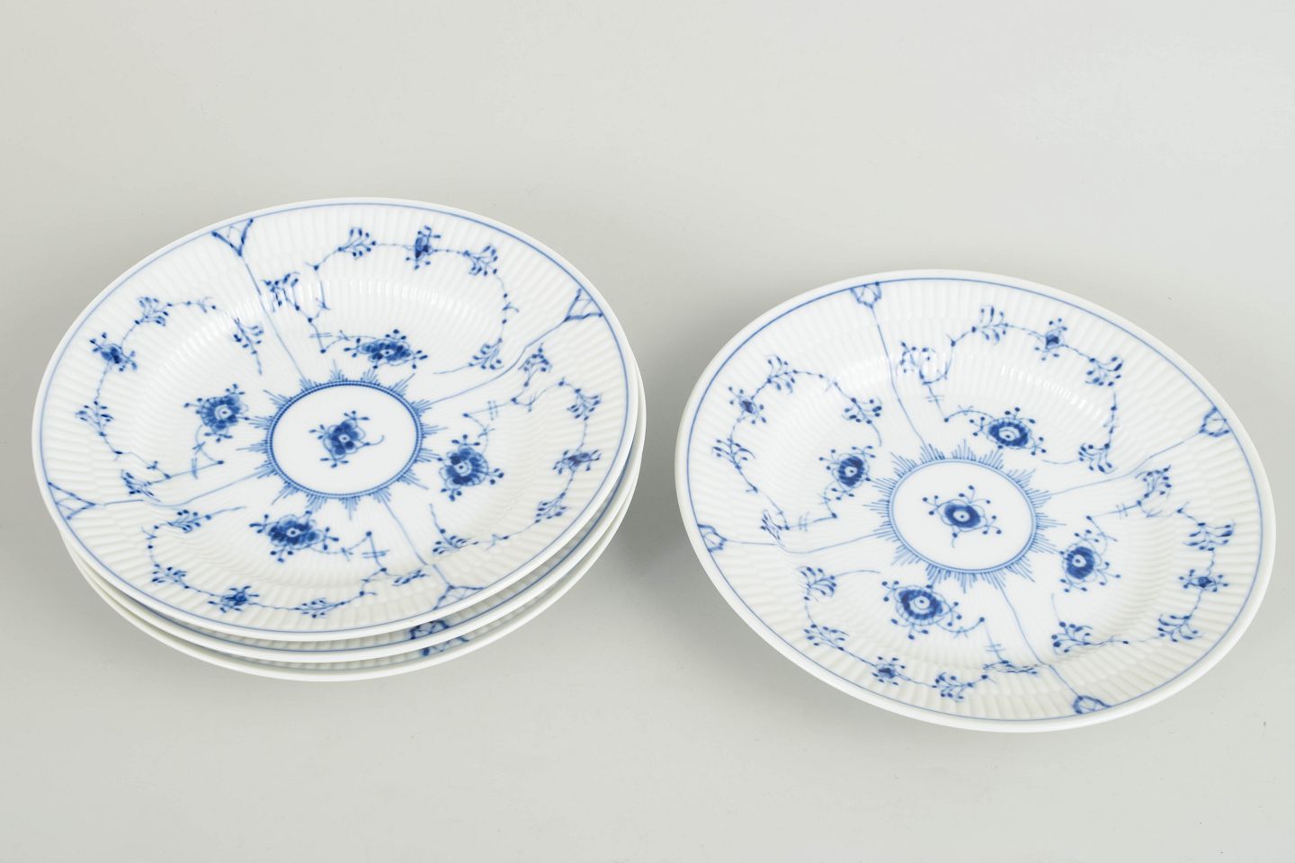 Sæt af fire frokosttallerkener i håndmalet porcelæn fra Musselmalet Riflet med klassisk underglasurdekoration i koboltblå og riflede felter. Model 1/178. Diameter 21 cm. Første sortering. Fremstillet i 1980’erne.