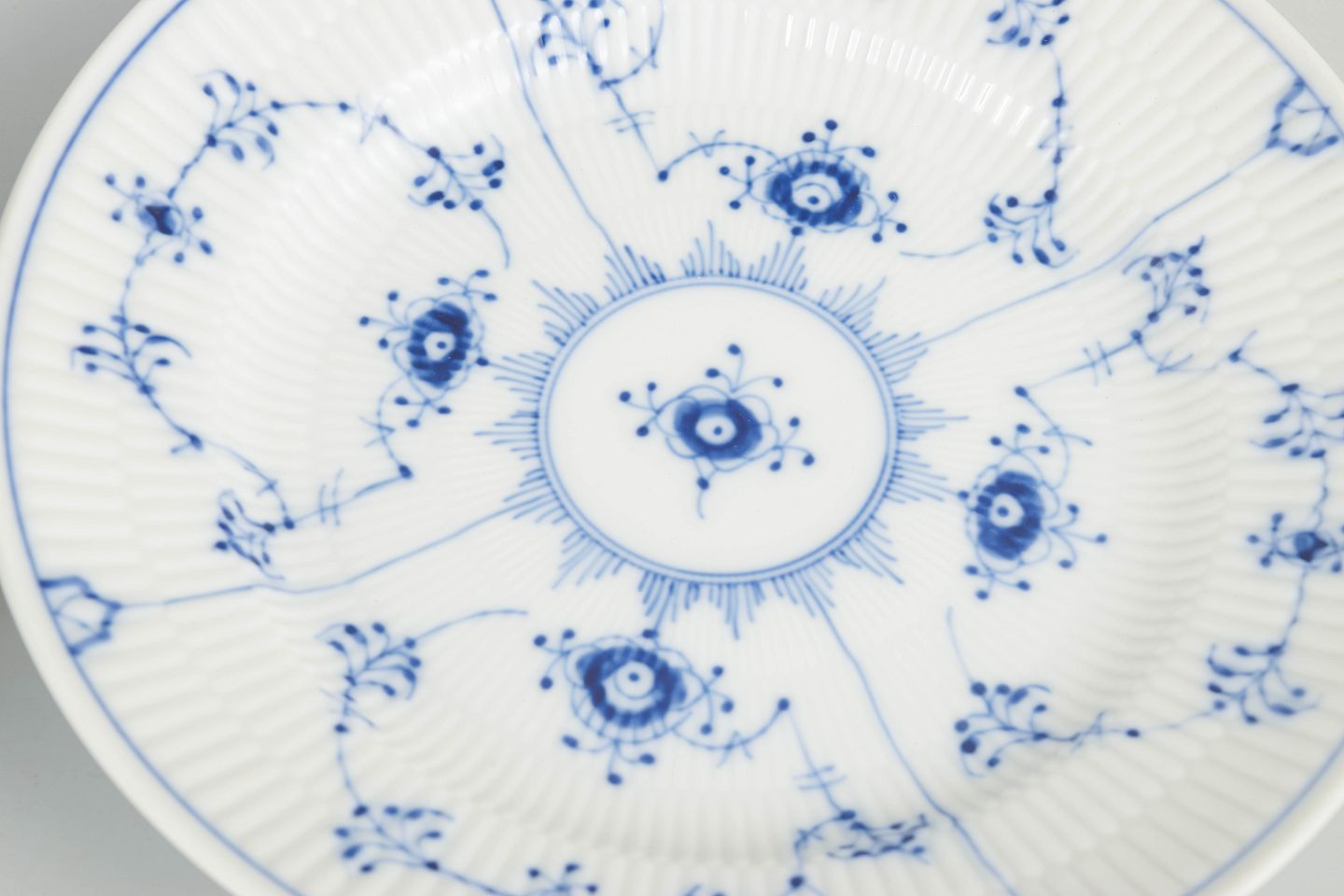 Royal Copenhagen blev grundlagt i 1775 i København under kongelig bevilling. Fabrikken er internationalt anerkendt for sit håndmalede porcelæn og sit høje kunstneriske niveau. Musselmalet Riflet er fabrikkens mest klassiske stel, introduceret i slutningen af 1700-tallet og fortsat produceret med traditionelle håndværksmetoder.