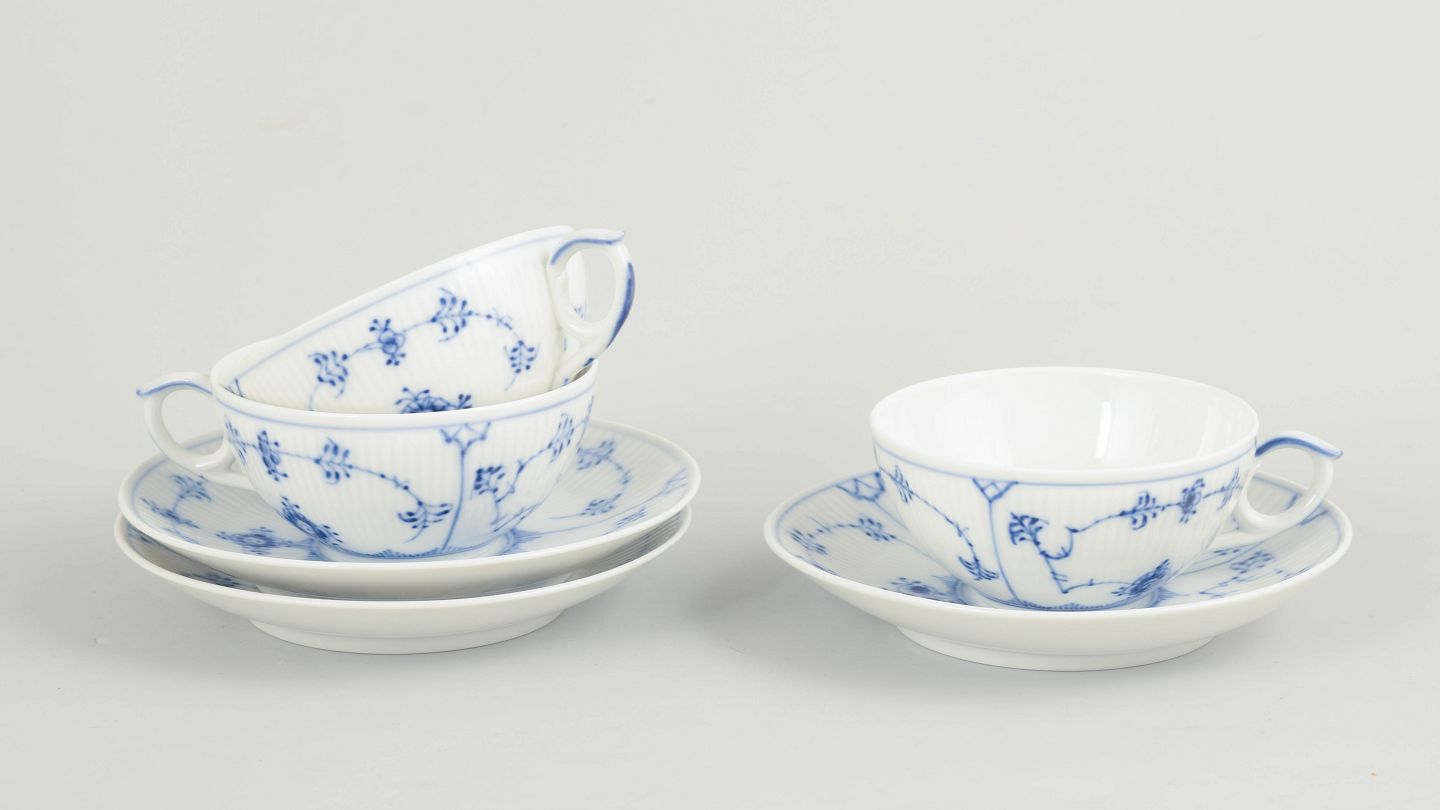 Sæt af tre tekopper med tilhørende underkopper i håndmalet porcelæn fra Musselmalet Riflet med klassisk underglasurdekoration i koboltblå og riflede felter. Model 1/76. Kopper H. 5 cm, D. 12 cm. Underkopper D. 15 cm. Første sortering. Fremstillet i 1960/80’erne.
