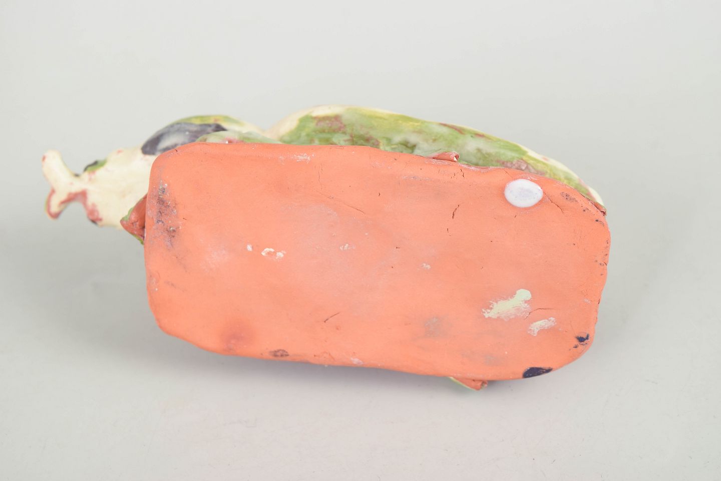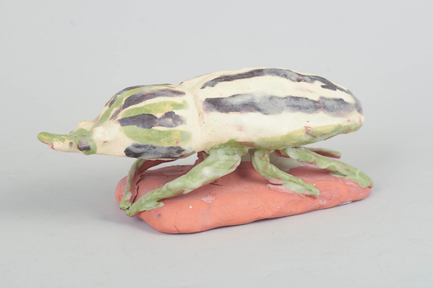 Unique ceramic sculpture depicting an insect executed in stoneware with light glaze decorated with green and darker tonal accents. The figure is modelled in a stylised naturalistic form and placed on a small clay base, giving the piece a sculptural and lively character. Unsigned unique work from the 1970s.