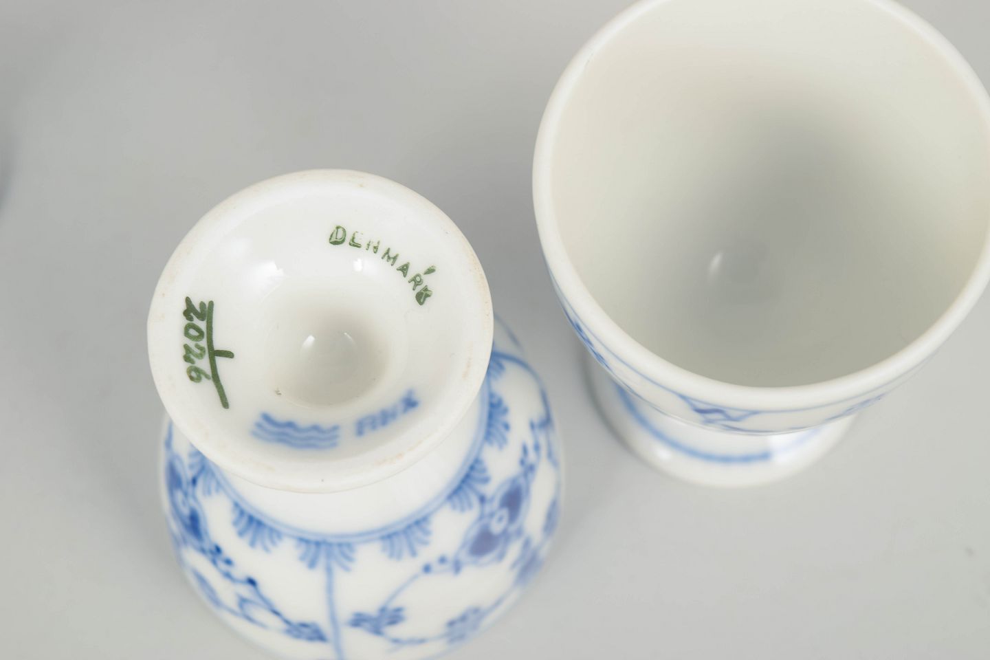 Sæt af fire håndmalede æggebægre i porcelæn dekoreret med det klassiske musselmalede riflet mønster i blå underglasur. Æggebægrene har rund skålformet overdel og lille fod, dekoreret med de karakteristiske blomsterornamenter og slyngede blomstergrene fra serien. Undersiden er fabriksstemplet Royal Copenhagen, første sortering. Model 1/2026.