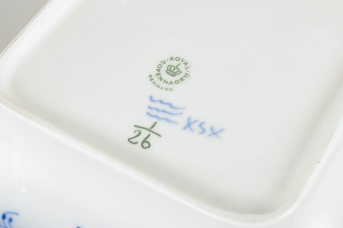 Hand-painted porcelain bowl decorated with the classic blue fluted pattern in cobalt underglaze. The bowl features an elegant square form with gently curved sides and fluted detailing in the body. At the centre is the characteristic floral motif surrounded by stylised floral garlands. Marked underneath with the Royal Copenhagen factory mark and first factory quality. Model 1/26.